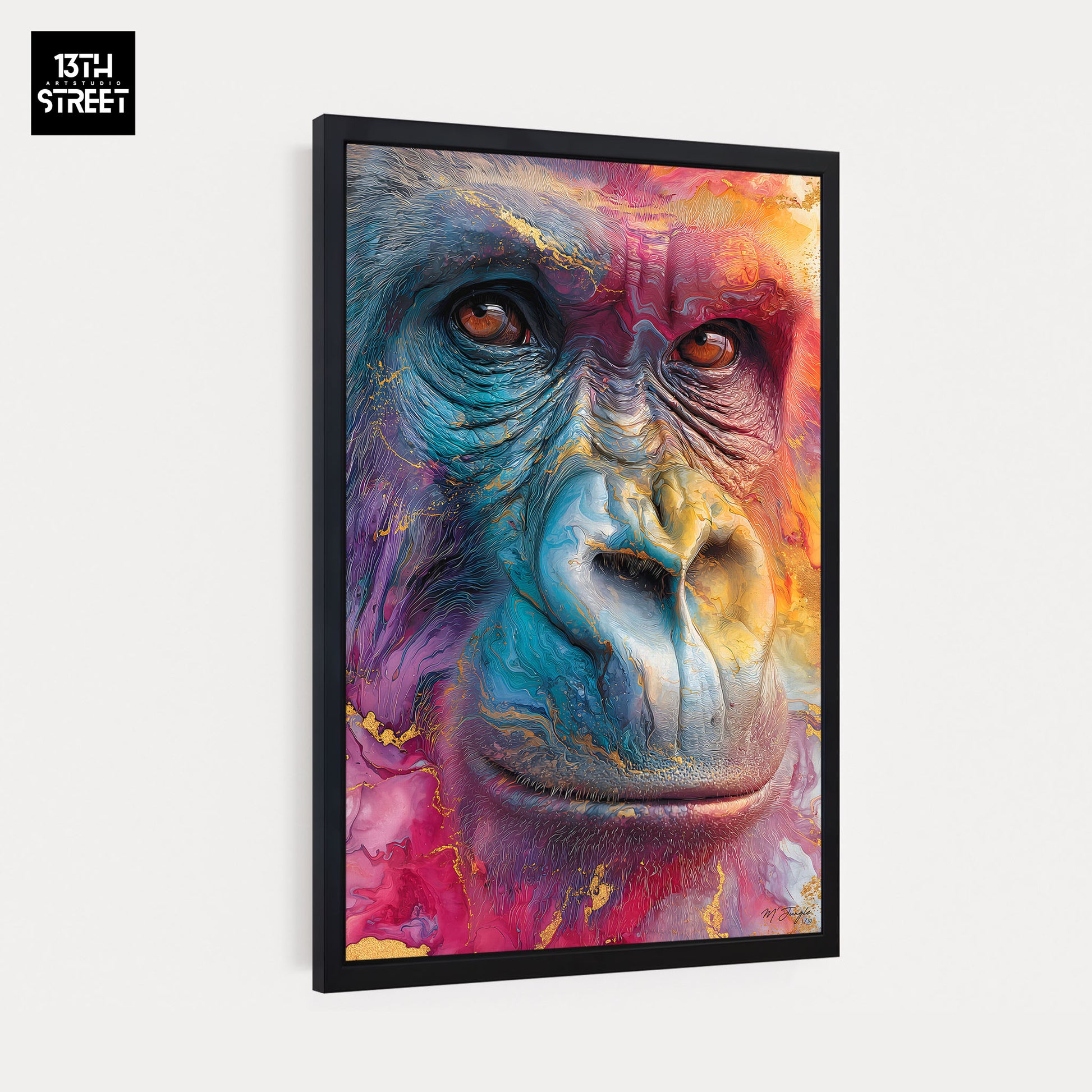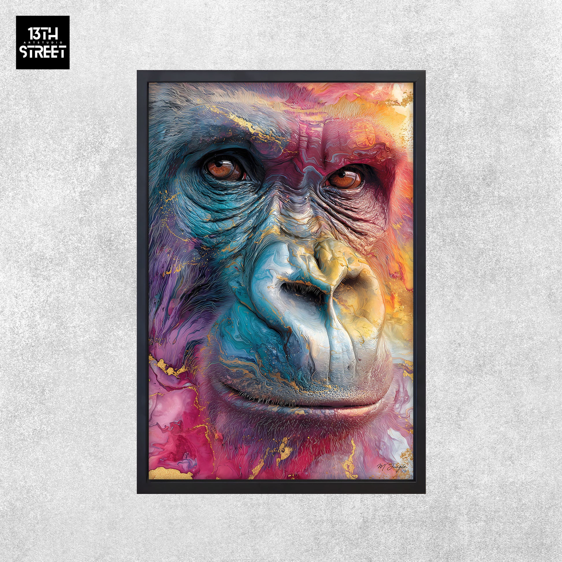 Découvrez "Pensée profonde" par l’artiste Miss Jungle. Dans un univers artistique animalier, l’œuvre représente gorille dans un portrait coloré aux nuances intenses, sublimé par un effet marbré apportant matière et profondeur visuelle. Le regard concentré du primate et la densité de sa présence traduisent la réflexion, la conscience et la force intérieure.