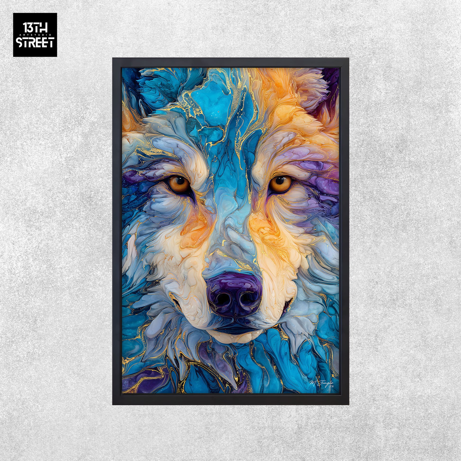 Découvrez "Stabilité intérieure" par l’artiste Miss Jungle. Dans un univers artistique animalier, l’œuvre représente loup dans un portrait coloré aux nuances profondes, sublimé par un effet marbré apportant texture et densité visuelle. Le regard posé et la posture maîtrisée du loup traduisent la force calme et l’équilibre instinctif du sujet.