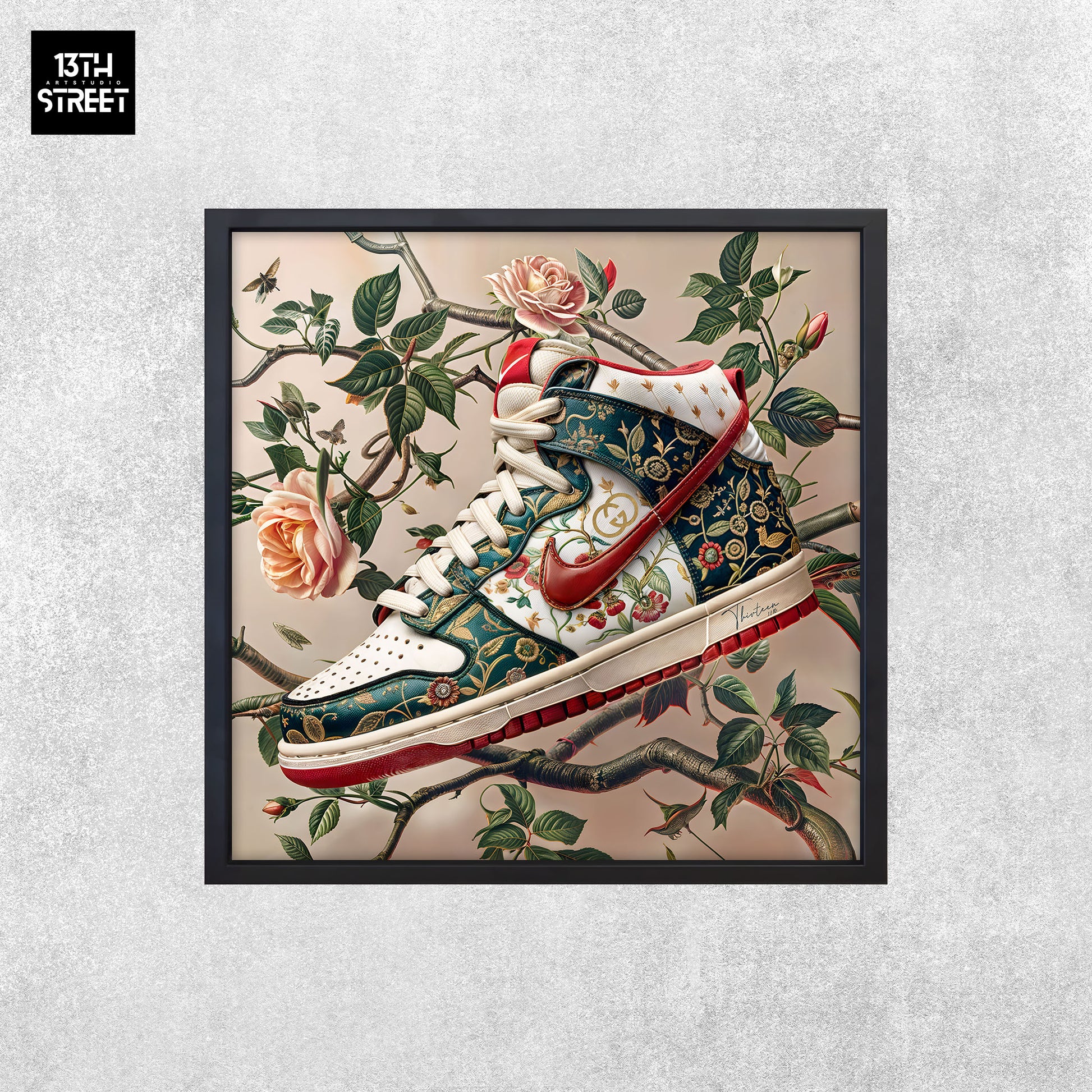 Schauen Sie sich „ Nike Jordan by Gucci “ des Künstlers Thirteen an. Dieses elegante Werk vereint die raffinierte Raffinesse von Gucci mit der ikonischen Silhouette des Nike Jordan und schafft so ein Stück, das zeitlosen Luxus und modernen, schicken Stil vereint. „Nike Jordan by Gucci“ ist eine limitierte Edition , die Ihrer Sammlung einen Hauch von Glamour und Raffinesse verleiht, indem sie die Essenz des italienischen Chic von Gucci einfängt und gleichzeitig das kühne Design von Jordans zelebriert. Tauchen Sie ein in das prestigeträchtige Universum von Thirteen, unterstützt von der Künstlergemeinschaft 13th Street Art . Verwandeln Sie Ihren Raum mit diesem Werk, das die perfekte Mischung aus ikonischem High-Fashion-Luxus verkörpert.