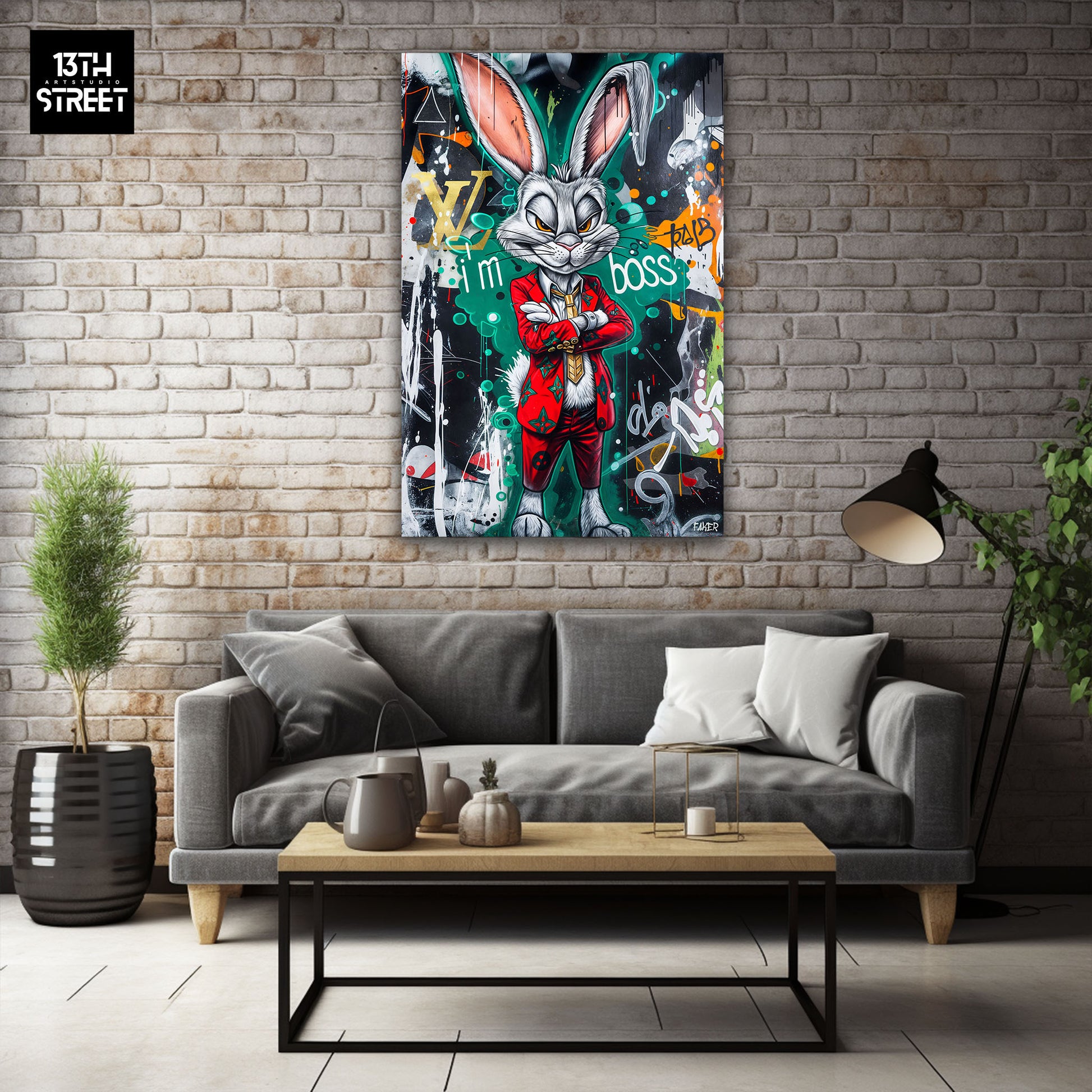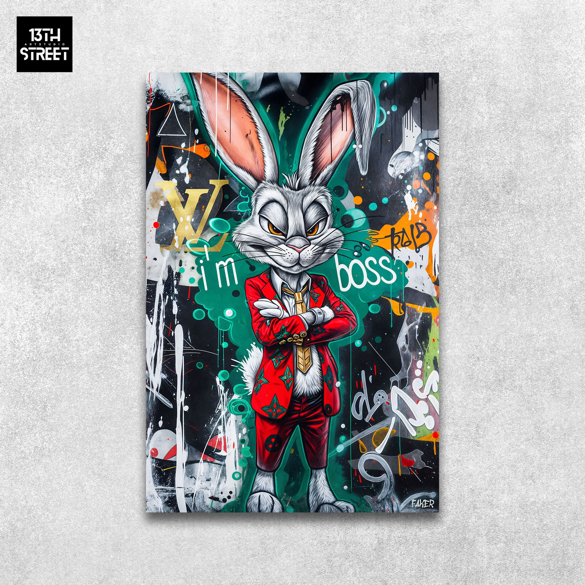 Discover " Bugs Bunny I'm Boss " by artist Faker . This canvas features Bugs Bunny in a bold and personality-filled leadership pose. The iconic cartoon character is transformed into a dominant figure, displaying his carefree attitude with a touch of dynamic street art. Faker uses vibrant colors and urban graphic elements to bring Bugs Bunny to life, accentuating his charismatic charm and self-confidence. "Bugs Bunny I'm Boss" is an Artwork that combines classic humor with modern art, bringing a touch of fun and style to your collection. Supported by the 13th Street Art community, this unique canvas infuses your space with playful and assertive energy.
