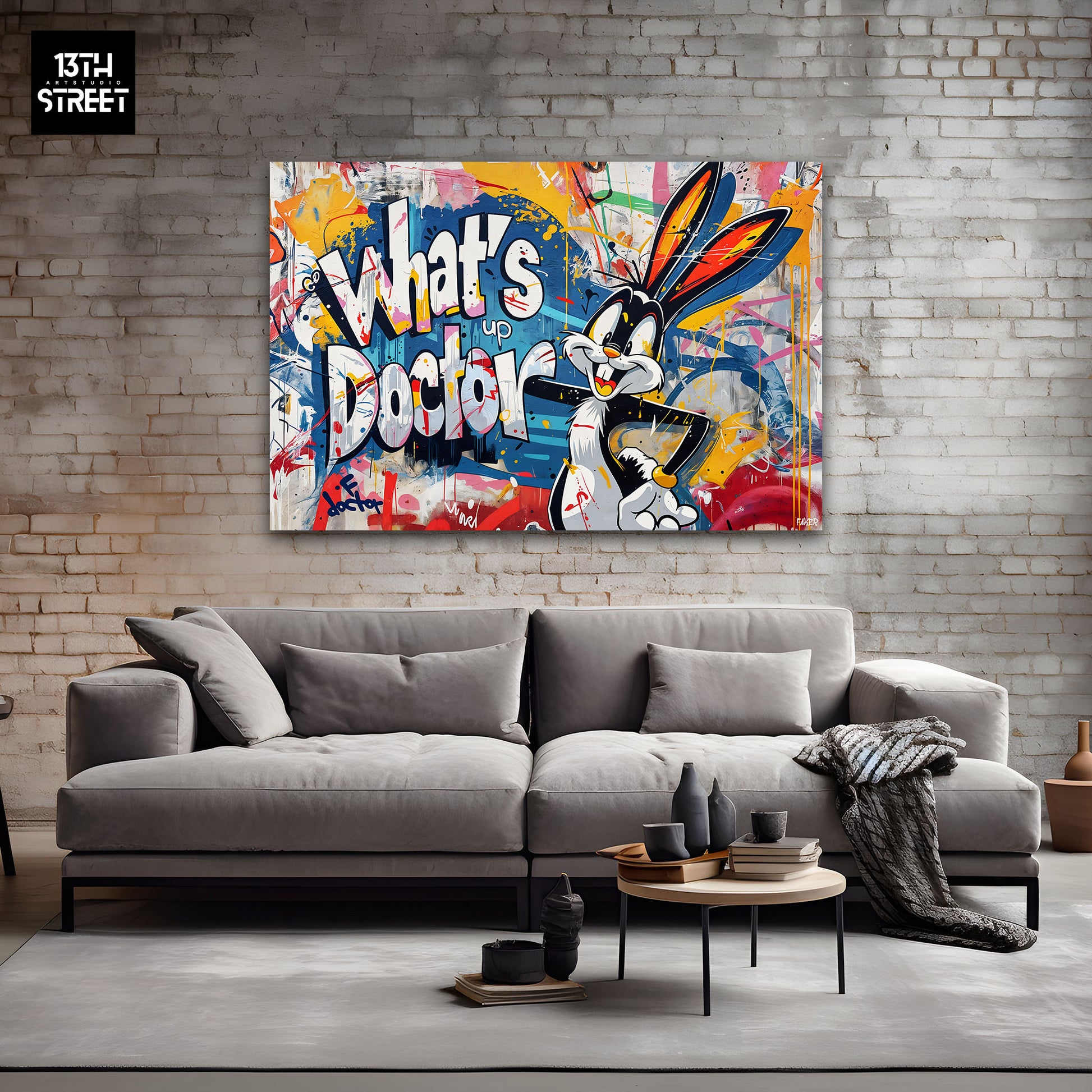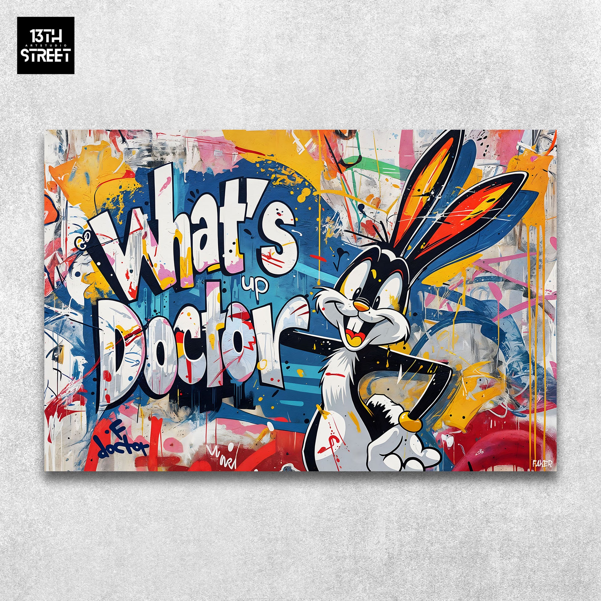Discover " Bugs Bunny What's Up Doctor " by artist Faker . This artwork captures the cheeky essence of the legendary Bugs Bunny, reimagined in a bold street art style. With a nod to his famous phrase, Bugs Bunny sports a relaxed yet provocative attitude, emphasizing the character's rebellious and ironic spirit. Bright colors and urban details enhance the composition's dynamism, while Faker injects contemporary energy into this animated classic. "Bugs Bunny What's Up Doctor" is an Artwork , which brings a playful and characterful touch to your collection. Explore Faker's subversive universe, supported by the artistic community 13th Street Art , and let this artwork infuse your spaces with its cheeky charm.