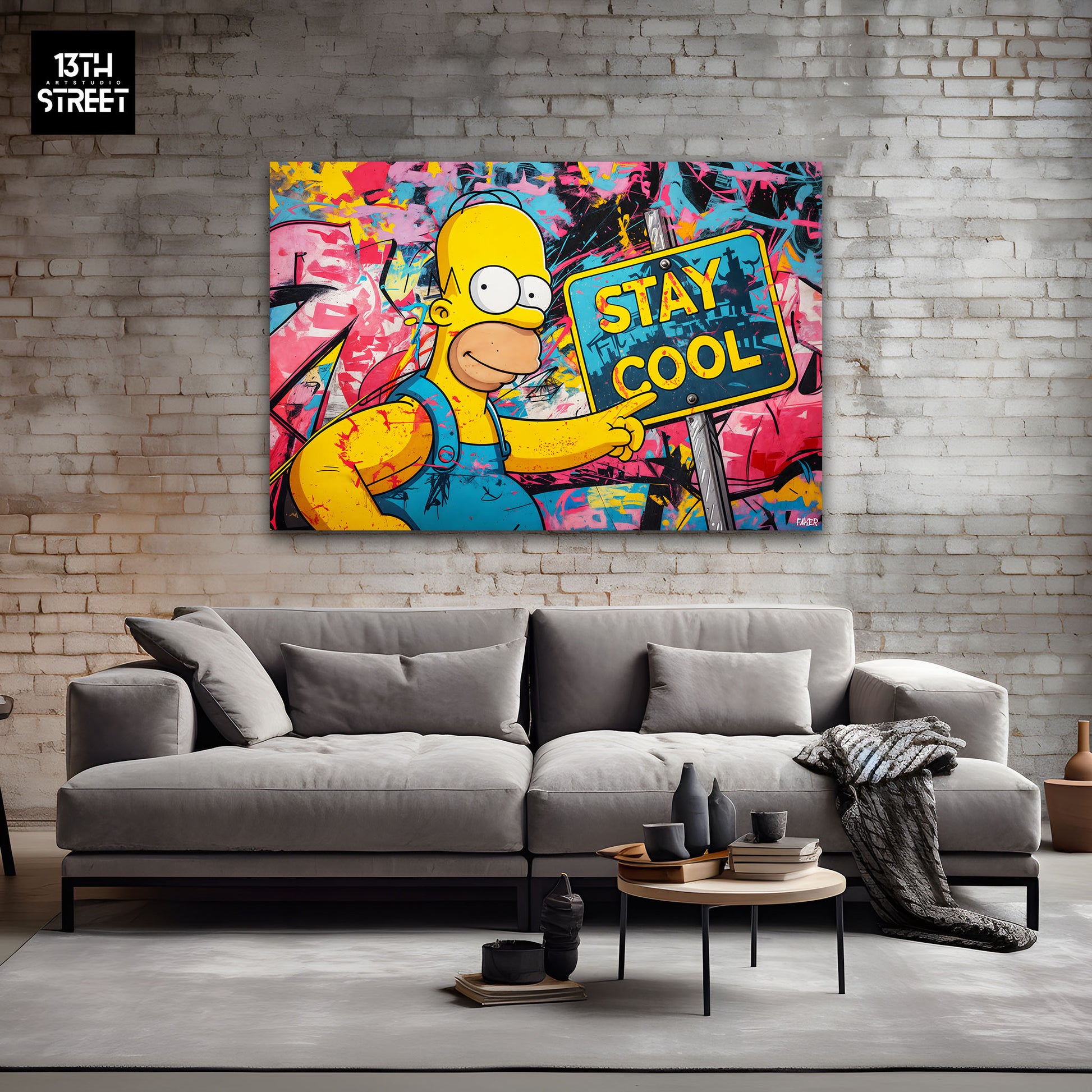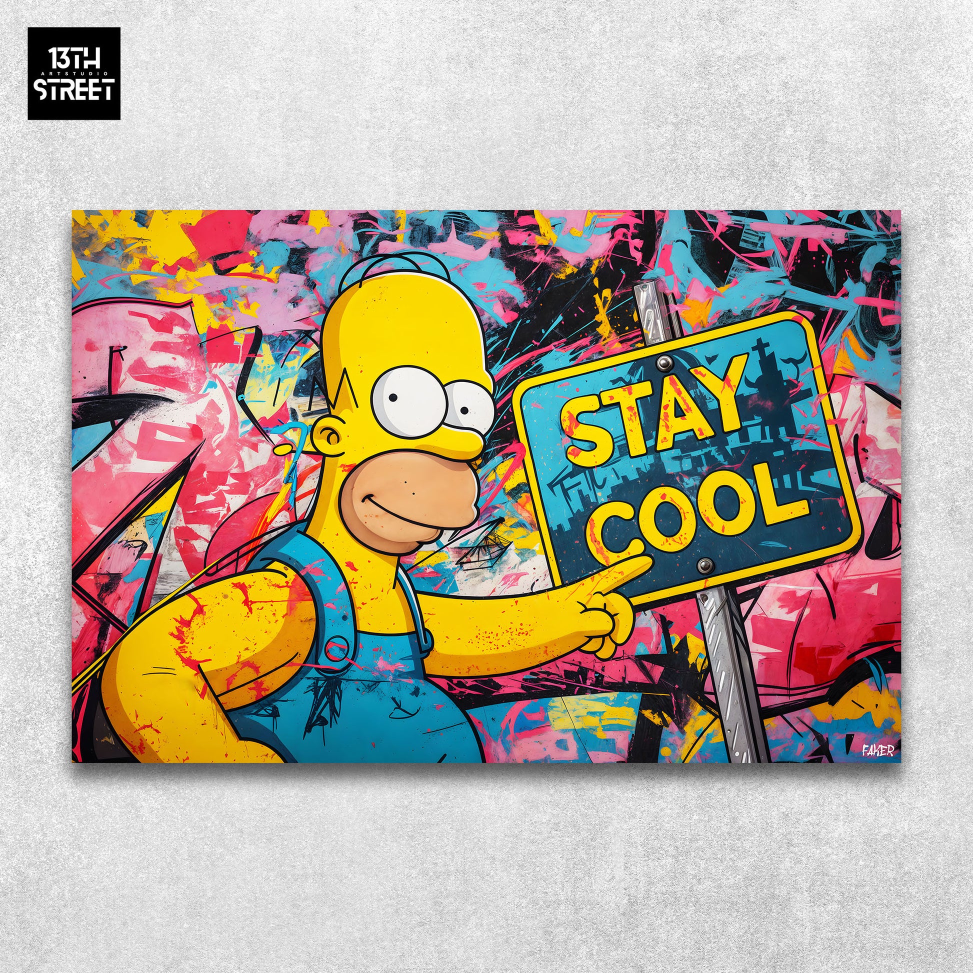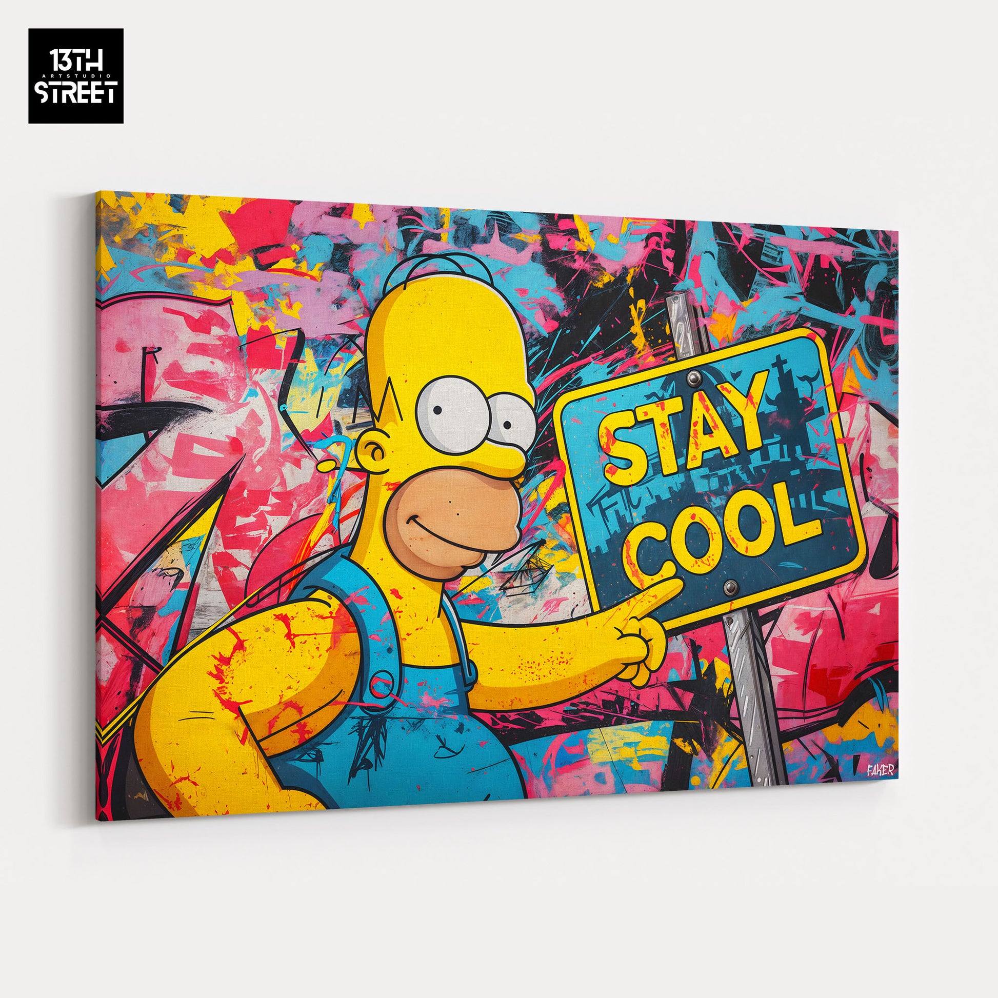 Discover " Homer Simpson Stay Cool " by artist Faker . This canvas captures the laid-back essence of Homer Simpson in a vibrant street art universe. With its bright colors and urban touches, "Homer Simpson Stay Cool" an Artwork presents Homer in all his iconic nonchalance, embodying the "cool" attitude in the face of everyday challenges. Faker combines humor and pop culture to bring this work to life, which mixes classic iconography with artistic modernity. Add a touch of irony and energy to your collection with this unique piece, supported by the artistic community 13th Street Art .