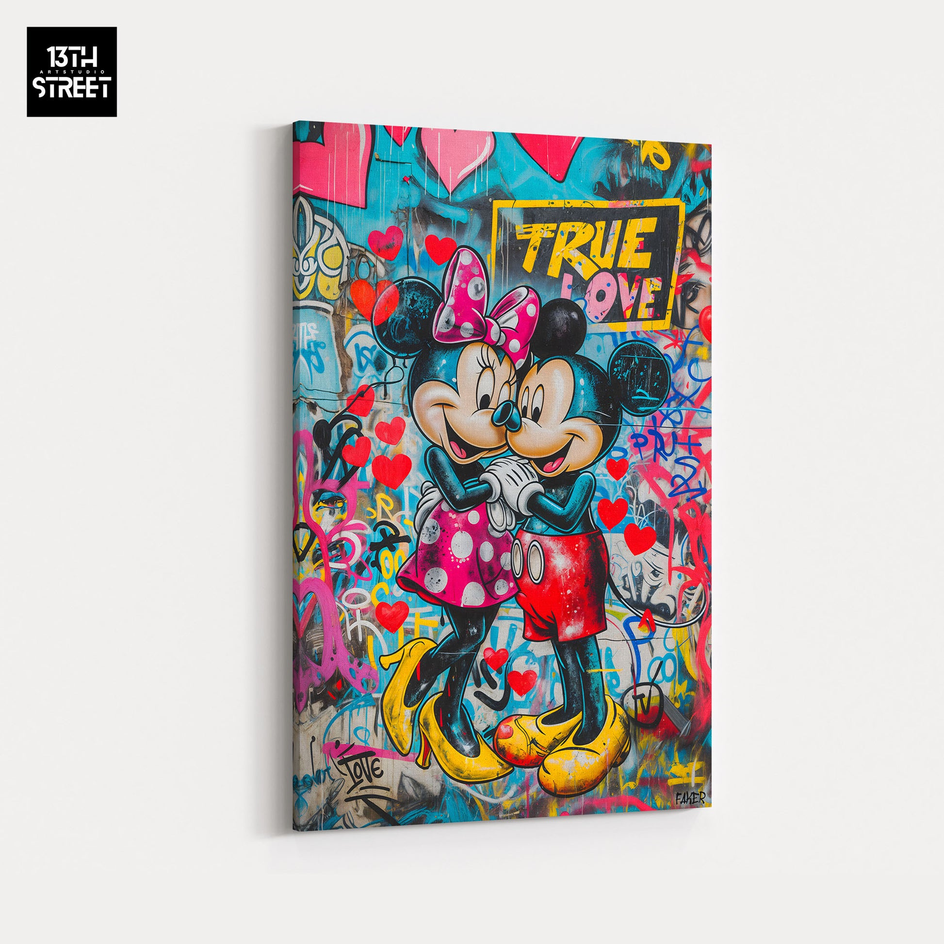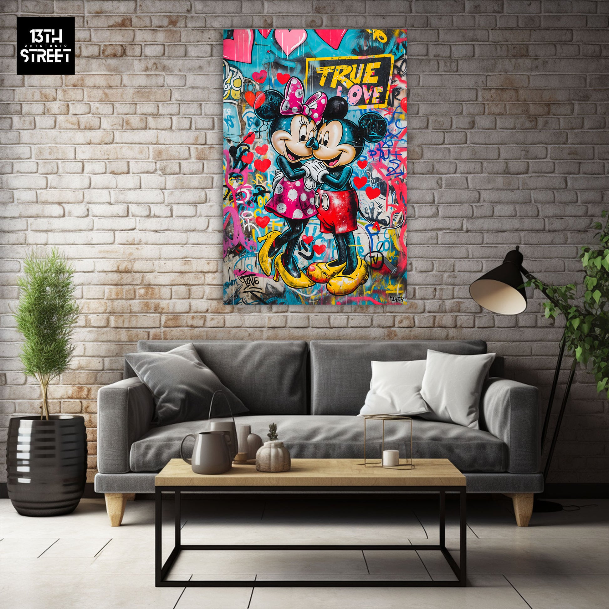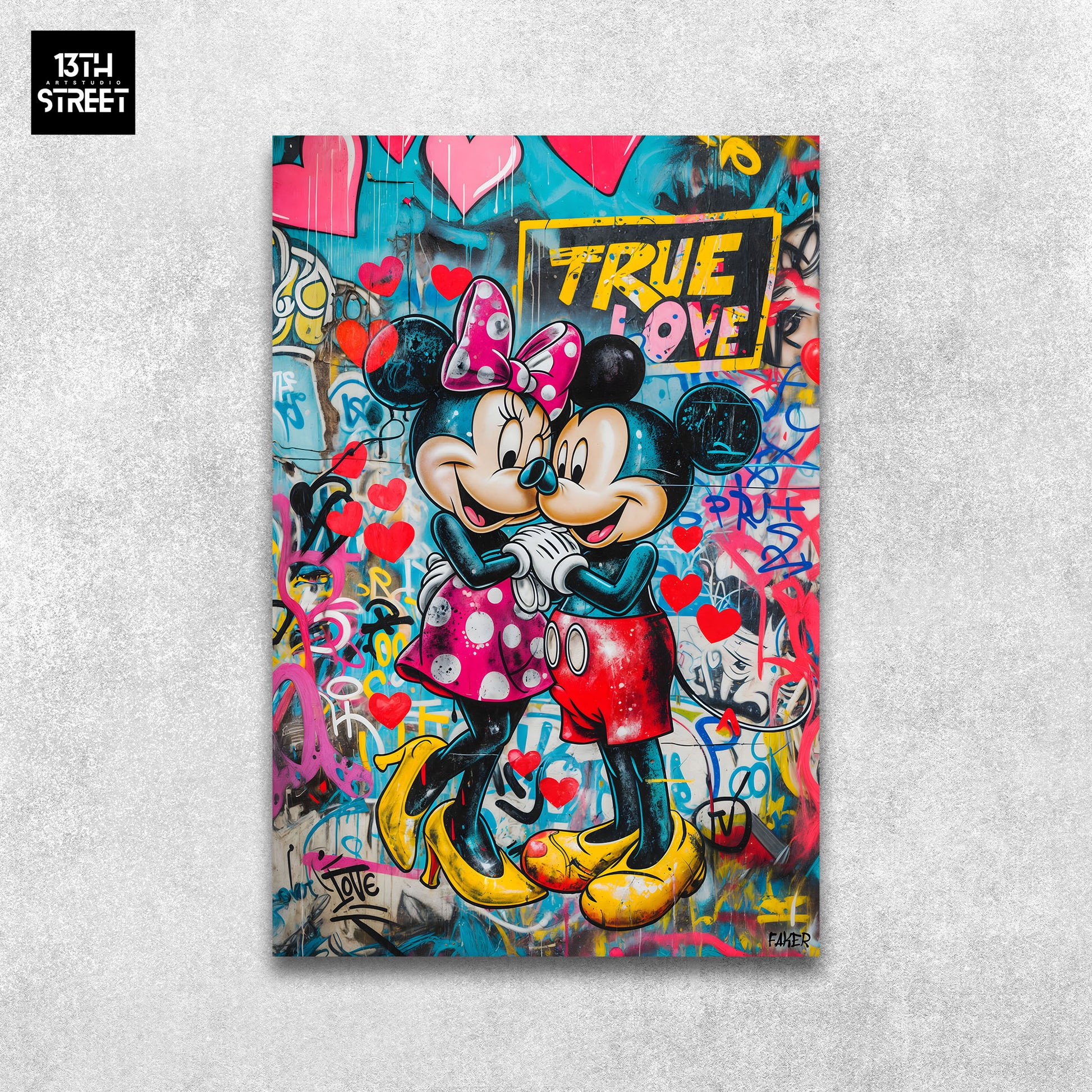 Discover " Mickey and Minnie True Love " by artist Faker . This canvas celebrates the timeless love between Mickey and Minnie Mouse in a modern and vibrant style. Capturing the tenderness and complicity of the iconic couple, this work uses vibrant colors and street art elements to add a dynamic twist to their classic romance. "Mickey and Minnie True Love" Artwork depicts the duo with palpable freshness and emotion, while staying true to their legendary charm. Supported by the 13th Street Art community, this unique canvas offers a visual declaration of everlasting love and injects a dose of romance and style into your space.