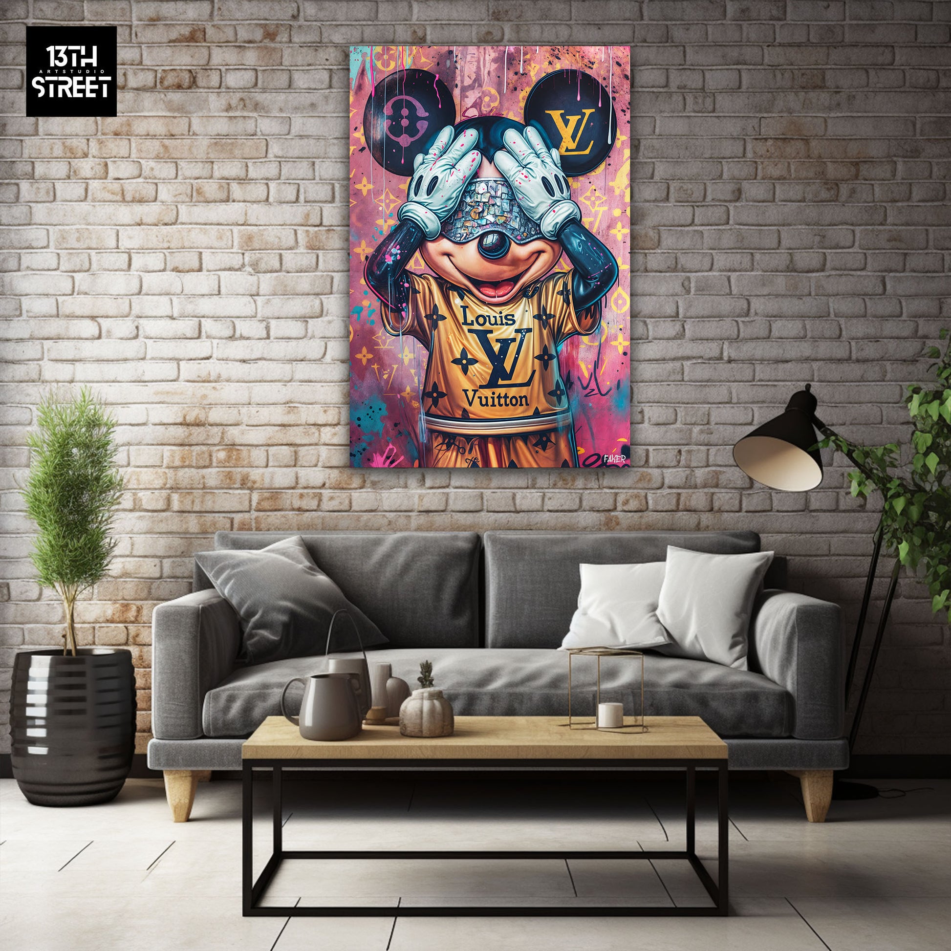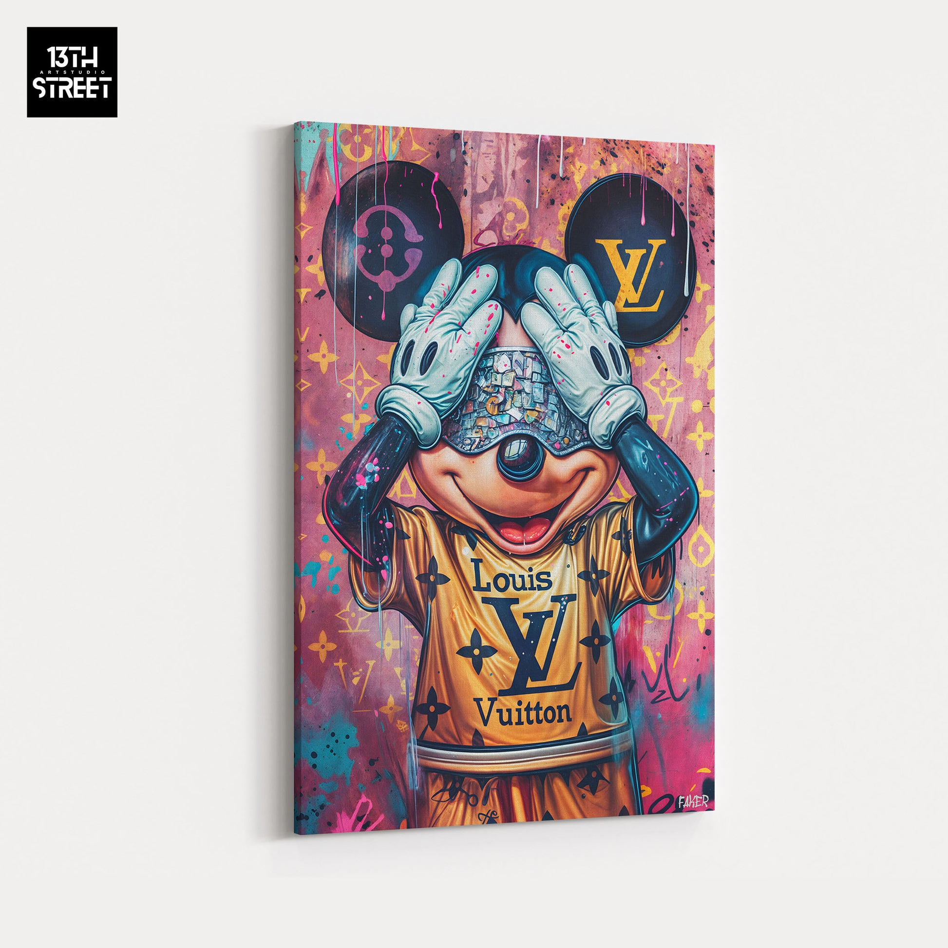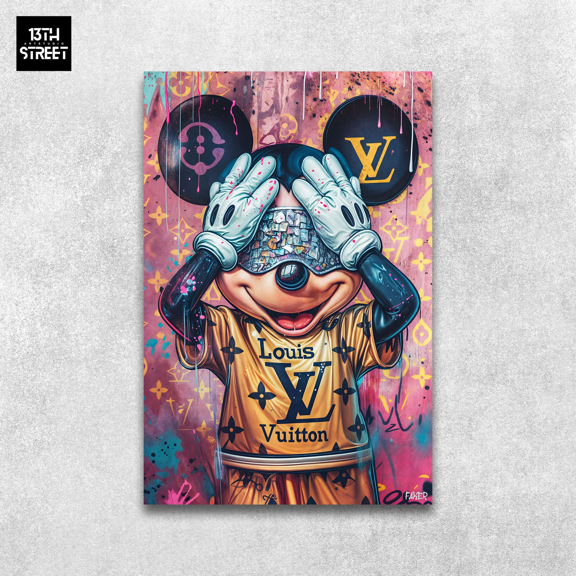 Discover " Mickey Luxe Louis Vuitton " by artist Faker . This canvas reimagines the famous Mickey Mouse with a touch of luxury and sophistication. Mickey is depicted in a refined style, dressed in iconic elements of the Louis Vuitton house, merging the world of street art with the glamour of haute couture design. The rich colors and elegant patterns highlight Mickey's iconic character while adding a dimension of prestige and modernity. "Mickey Luxe Louis Vuitton" is an Artwork that brilliantly blends pop culture and luxury, bringing a touch of opulence and style to your space. Supported by the artistic community 13th Street Art , this unique canvas transforms your collection with its distinctive shine and sophistication.