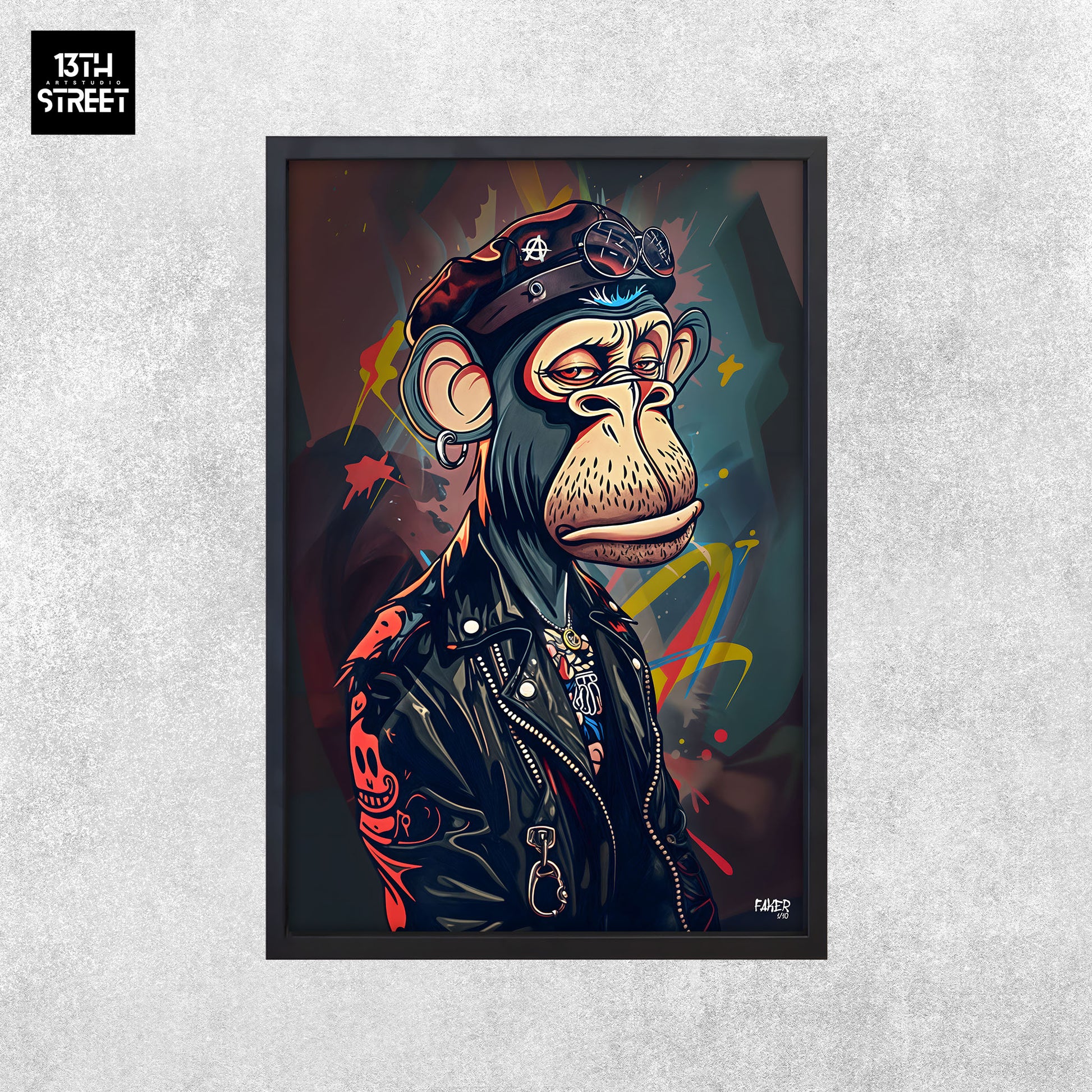 Discover " Monkey Bored Anarchist " by artist Faker . This artwork features a monkey as an anarchist, displaying an attitude of quiet boredom despite his rebellious look. Dressed in a leather jacket adorned with anarchist symbols and bold accessories, the character contrasts with his nonchalant air. The vibrant street art style and graphic details bring a contemporary and provocative touch to this unique piece. "Monkey Bored Anarchist" is a limited edition canvas that marries rebellion with offbeat irony, adding an original and captivating dimension to your space. Supported by the artistic community 13th Street Art , this piece is ideal for those who wish to enrich their collection with a work that combines subversive spirit and distinctive humor.