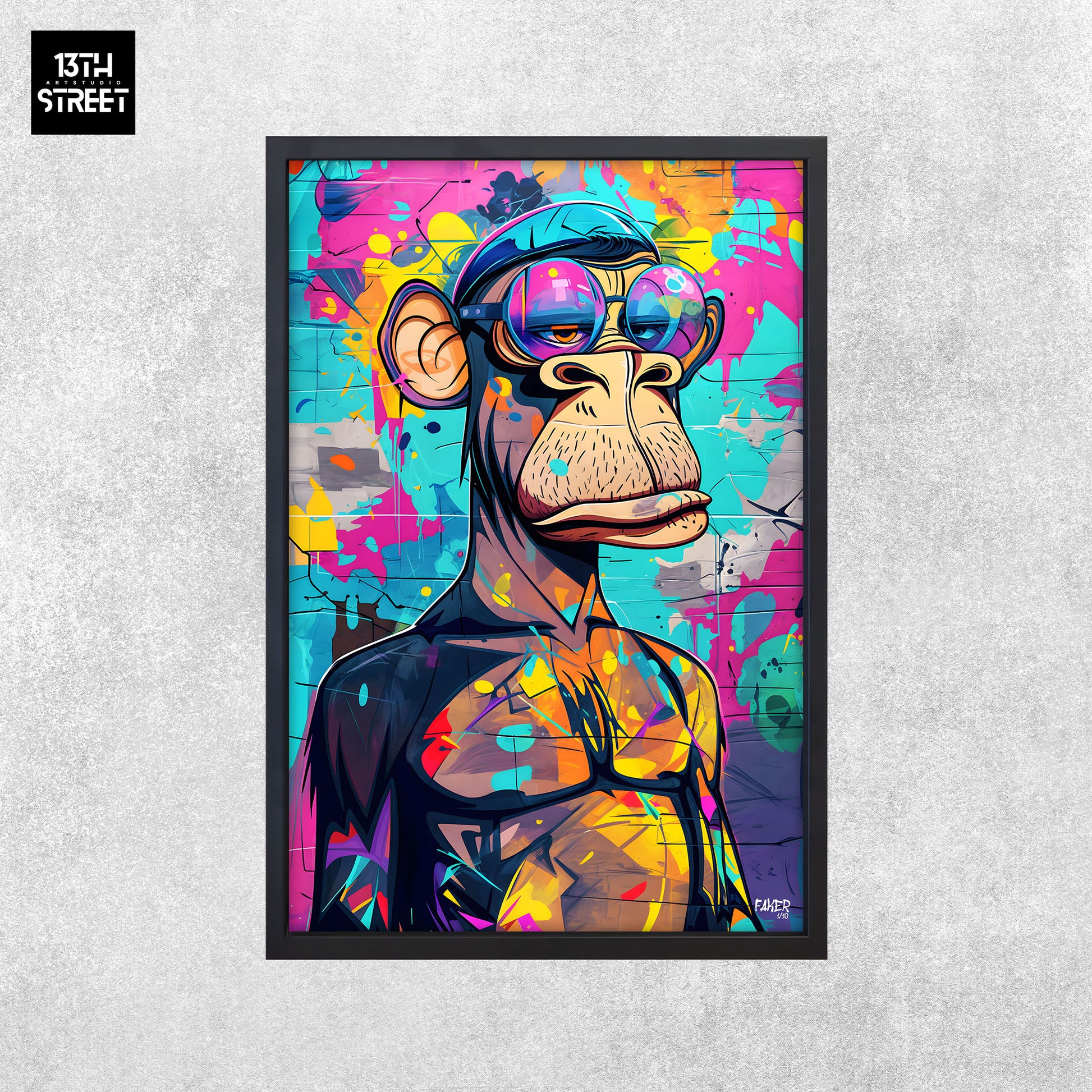 Check out " Monkey Bored Artist Painter " by artist Faker . This artwork depicts a monkey in the role of a painter, unclothed while displaying a hilariously bored expression. The character combines the creative world of painting with a casual and nonchalant attitude. The vibrant street art style and meticulous details capture both the seriousness of the art and the quirky humor of the character. "Monkey Bored Artist Painter" is a limited edition canvas that combines creativity and humor, adding a fun and original touch to your space. Supported by the 13th Street Art community, this piece is ideal for those who want to enrich their collection with a piece that combines art and unique personality.