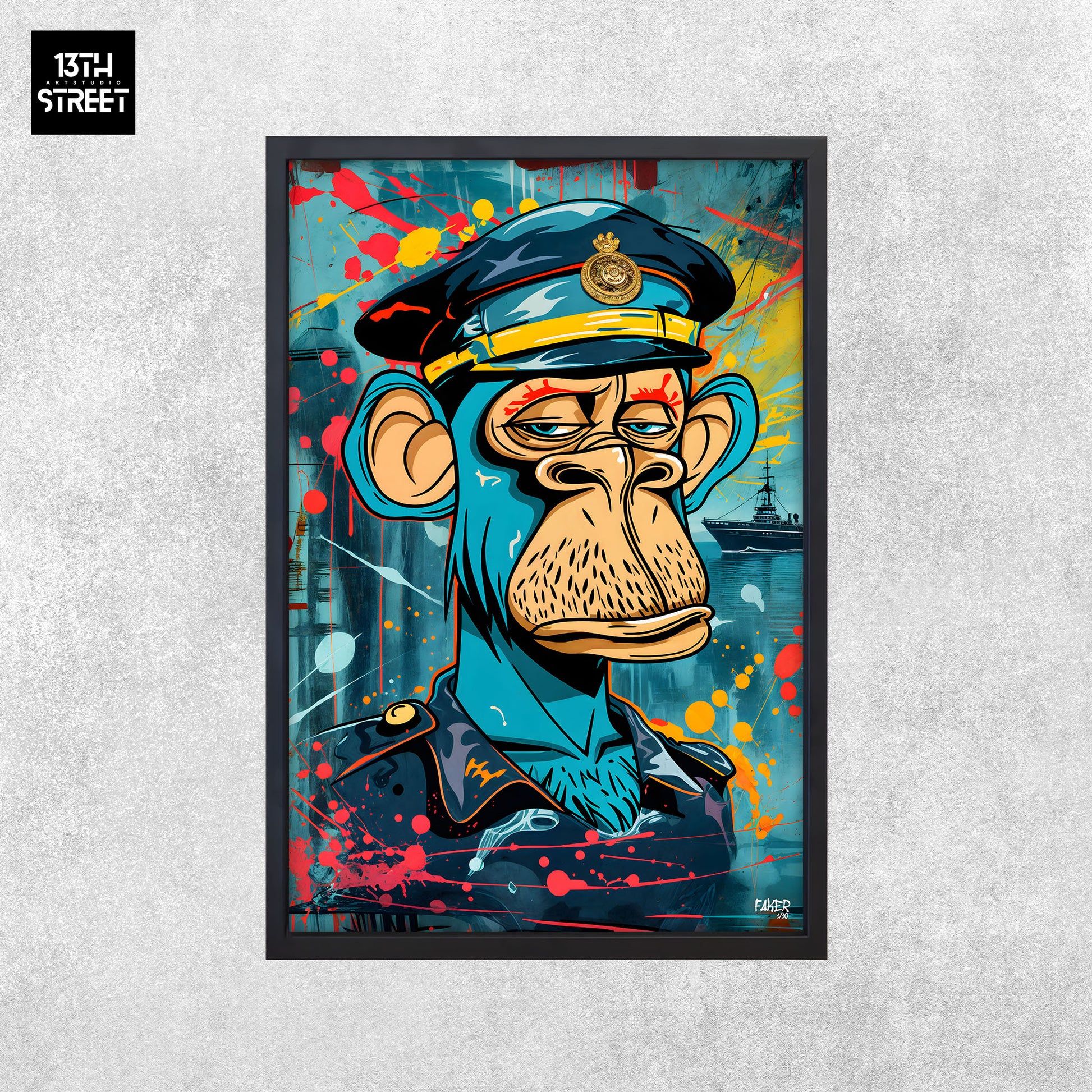 Check out " Monkey Bored Captain Boat " by artist Faker . This artwork depicts a monkey in a captain's uniform, ready to steer a ship, while displaying an expression of nonchalant boredom. The artwork juxtaposes the prestige and responsibility of the captain's position with the character's casual attitude, creating a comical and refreshing effect. The meticulous details and street art-inspired aesthetic bring a modern dynamic and a unique touch of humor to this piece. "Monkey Bored Captain Boat" is a limited edition canvas that combines the maritime world with a touch of playful disdain, enriching your space with a dose of originality and character. Supported by the 13th Street Art community, this artwork is perfect for those looking to add a touch of creativity and charm to their collection.