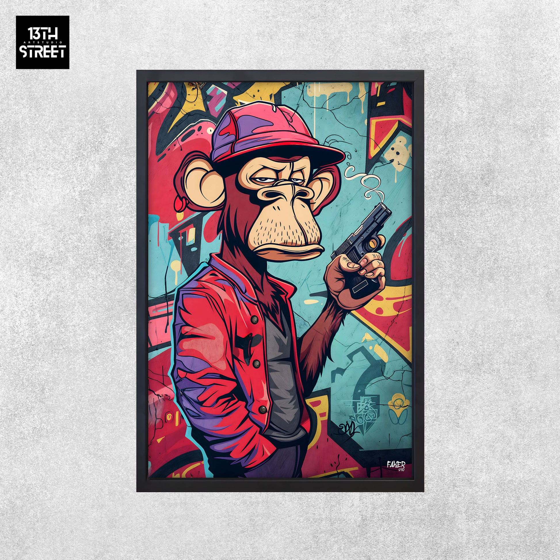 Check out " Monkey Bored Hold Up " by artist Faker . This artwork captures a monkey in full hold-up pose, with a casually bored expression. The contrast between the serious demeanor often associated with tense situations and the character's nonchalant air creates a humorous and refreshing irony. The bold details and street art-influenced style add a vibrant and modern dimension to this work. "Monkey Bored Hold Up" is a limited edition canvas that marries the energy of street art with a quirky sense of humor, bringing a touch of originality and character to your space. Supported by the 13th Street Art community, this unique piece is perfect for those looking to enrich their collection with a touch of bold creativity.