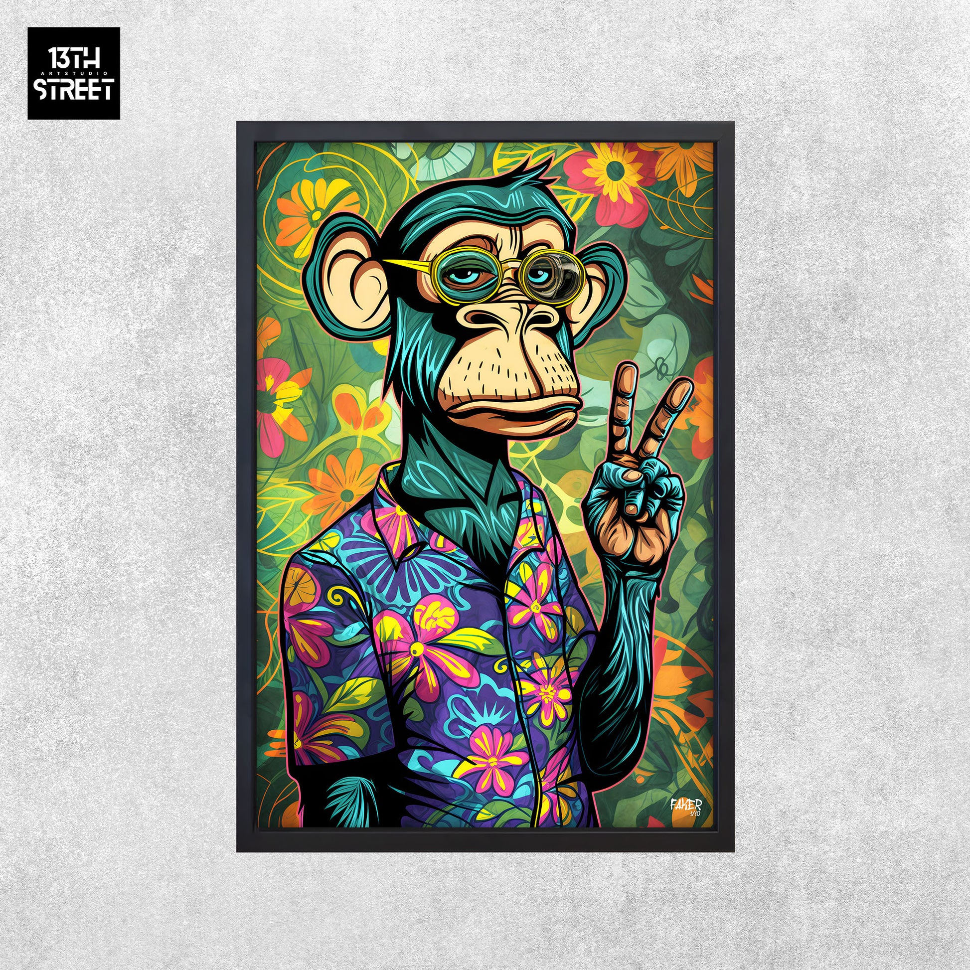 Discover “ Monkey Bored Peace and Love ” by artist Faker . This limited edition print features a monkey sporting sunglasses and a t-shirt adorned with peace and love symbols, while expressing a playful boredom. The contrast between the positive messages iconic to the 60s and the character’s casual attitude adds a touch of irony and humor to the work. The vibrant colors and street art elements enrich this canvas with a modern and dynamic energy. “Monkey Bored Peace and Love” is a limited edition work that combines pop culture and a quirky sense of humor, offering an original way to express timeless values. Supported by the artistic community 13th Street Art , this unique piece is ideal for those looking to add a touch of charm and character to their space.