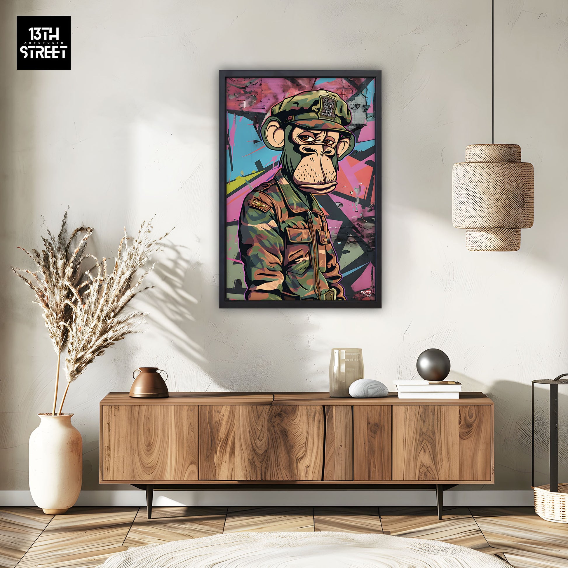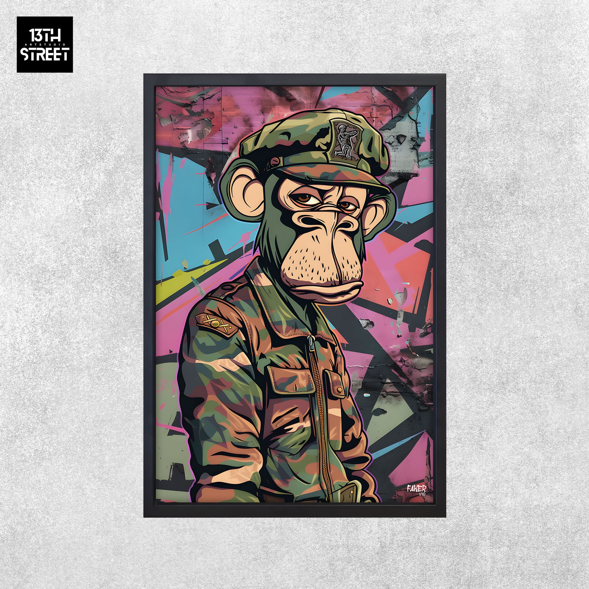 Discover " Monkey Bored Soldier " by artist Faker . This limited edition print features a monkey in military fatigues, sporting an air of nonchalant boredom despite his role as a soldier. The artwork juxtaposes the intensity associated with military life with the character's casual attitude, creating an intriguing and amusing visual irony. The striking details and modern street art style give this canvas a dynamic and contemporary energy. "Monkey Bored Soldier" is a limited edition canvas that blends military rigor with a touch of offbeat humor, bringing a refreshing originality to your space. Supported by the 13th Street Art community, this unique piece is perfect for those looking to add a touch of originality and character to their collection.