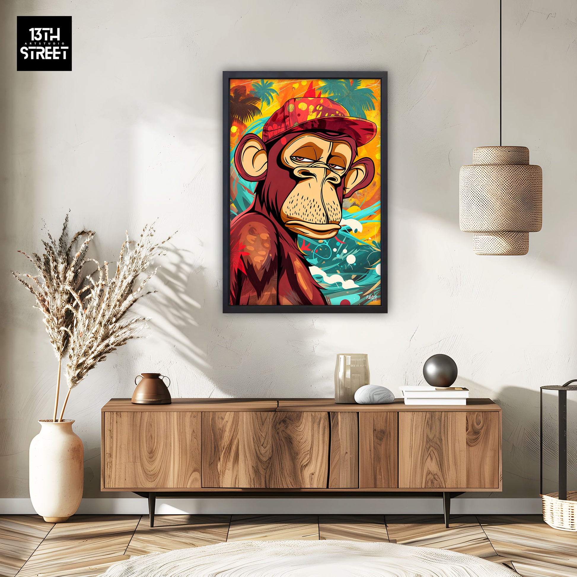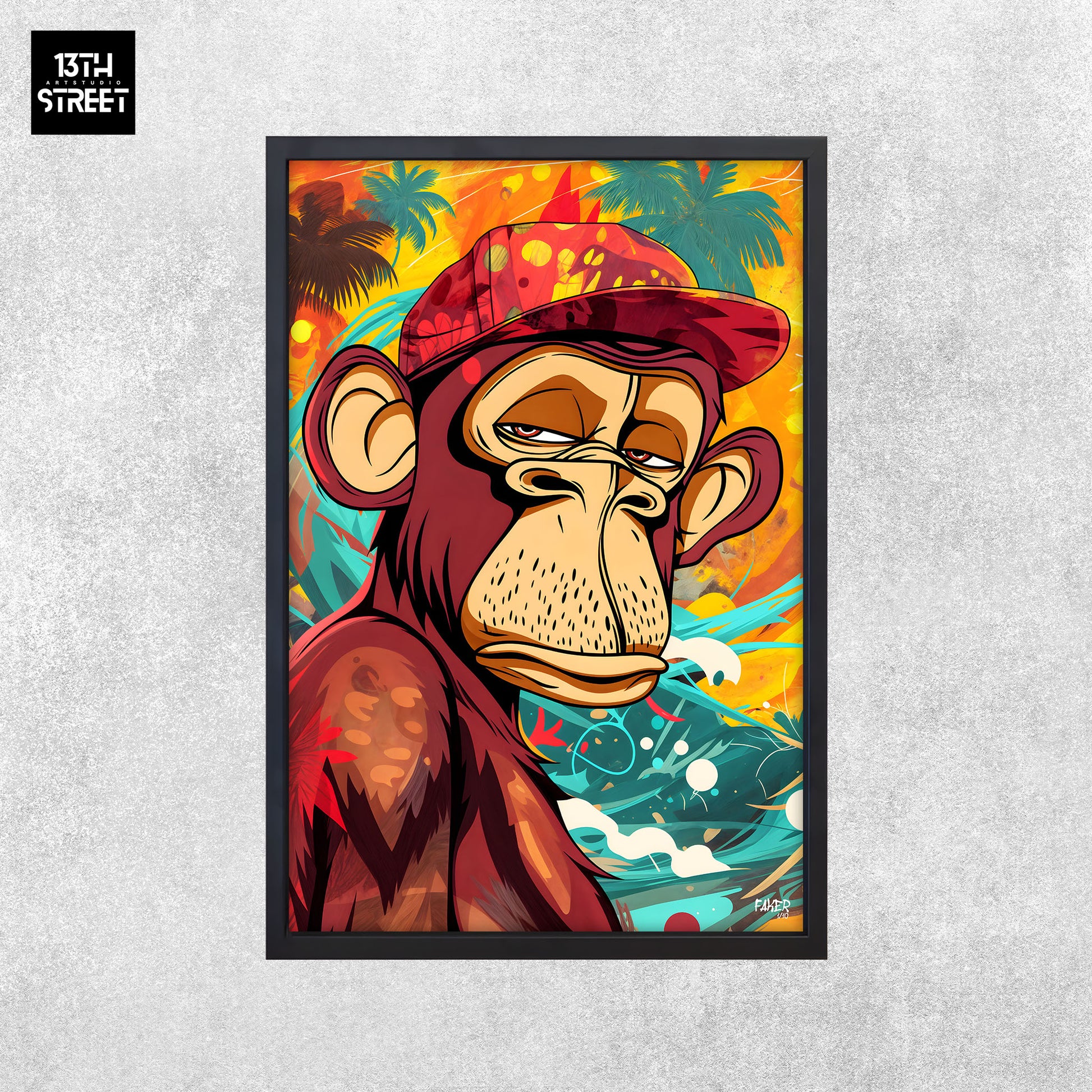 Discover " Monkey Bored Surfer " by artist Faker . This limited edition print captures a monkey in a relaxed look. In a beachy mood and ready for adventure, the monkey displays a playful expression of boredom, adding a touch of irony to the scene. The vibrant details and street art influences bring a dynamic and contemporary dimension to the work. "Monkey Bored Surfer" is a limited edition piece that combines the spirit of surfing with a dose of refreshing humor, enriching your space with a unique blend of style and creativity. Supported by the 13th Street Art community, this exclusive canvas is perfect for those looking to inject a touch of casualness and personality into their decor.