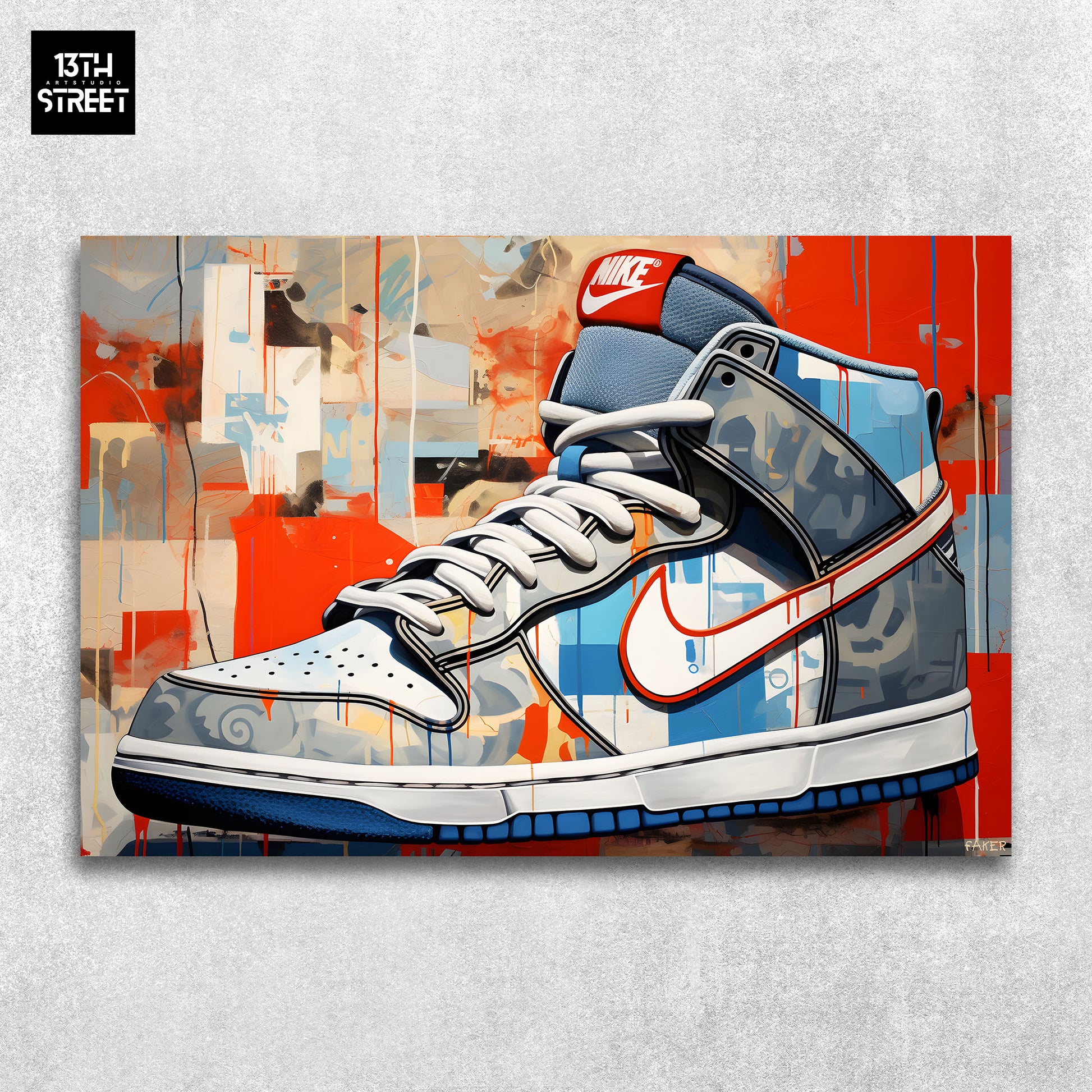 Discover " Nike Air Jordan " by artist Faker . This bold canvas features a unique artistic interpretation of Nike shoes, capturing the bold aesthetic of street style. "Pimp Nike Shoes" is a Special Artwork , bringing a special exclusivity to your collection. Immerse yourself in Faker's creative universe, supported by the 13th Street Art community. Transform your space with a dose of emotion and style with this canvas that celebrates individuality and expression through the lens of street fashion.