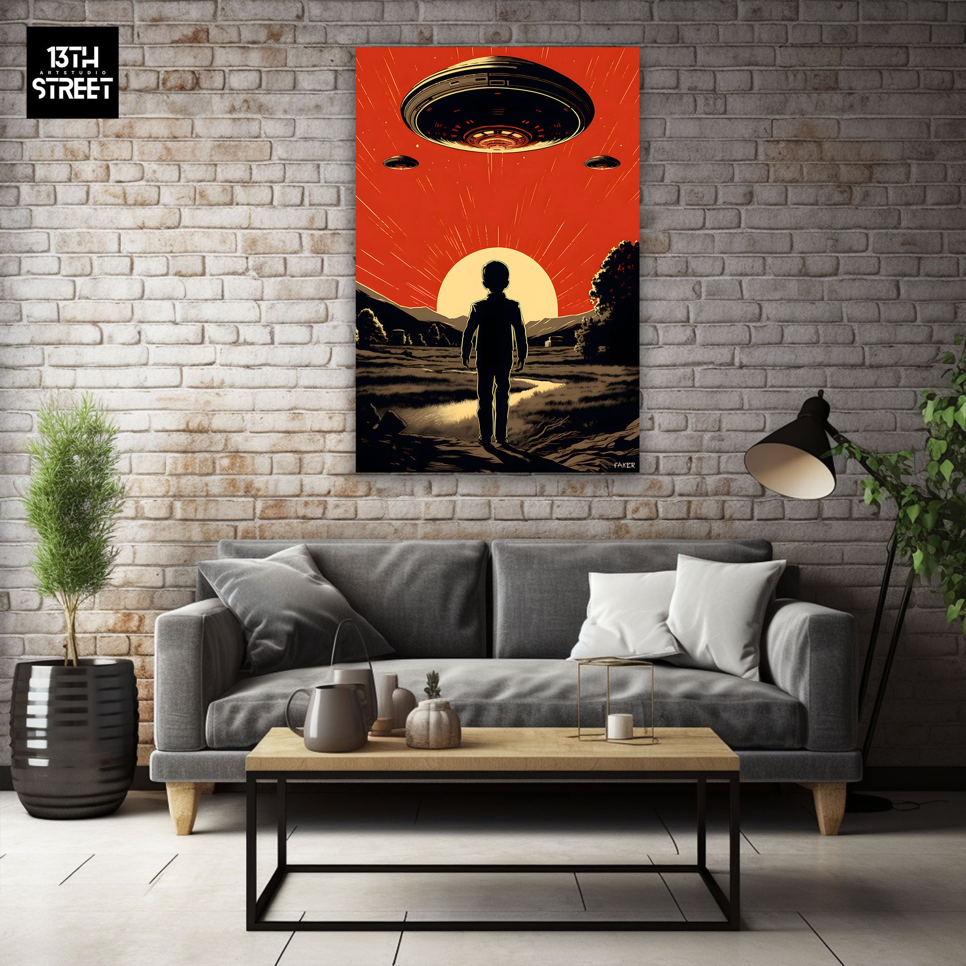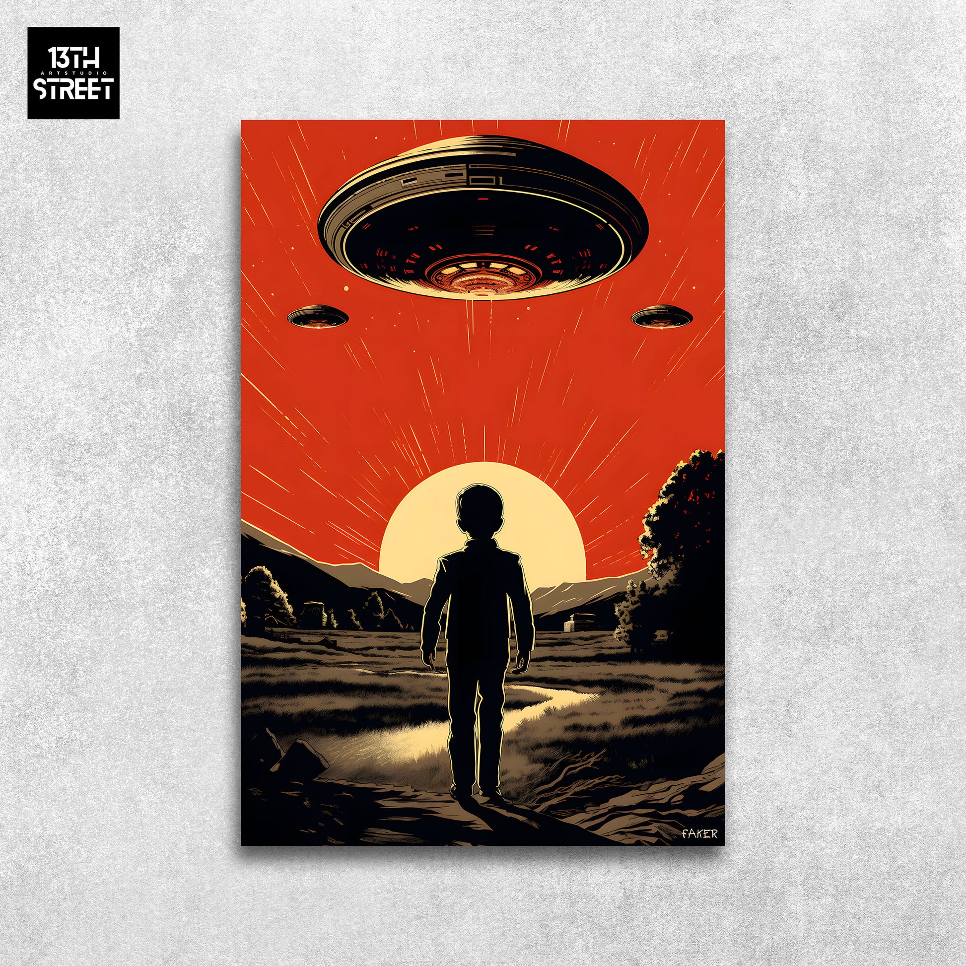 Discover " Our Dear Neighbors " by artist Faker . This striking canvas features an intriguing depiction of a child facing a flying saucer, evoking mystery and imagination. Our Dear Neighbors is an Artwork that captures the wonder and curiosity of childhood when faced with the unknown. Explore Faker's creative talent, supported by the artistic community of 13th Street Art , and let yourself be transported on a journey beyond the boundaries of imagination.