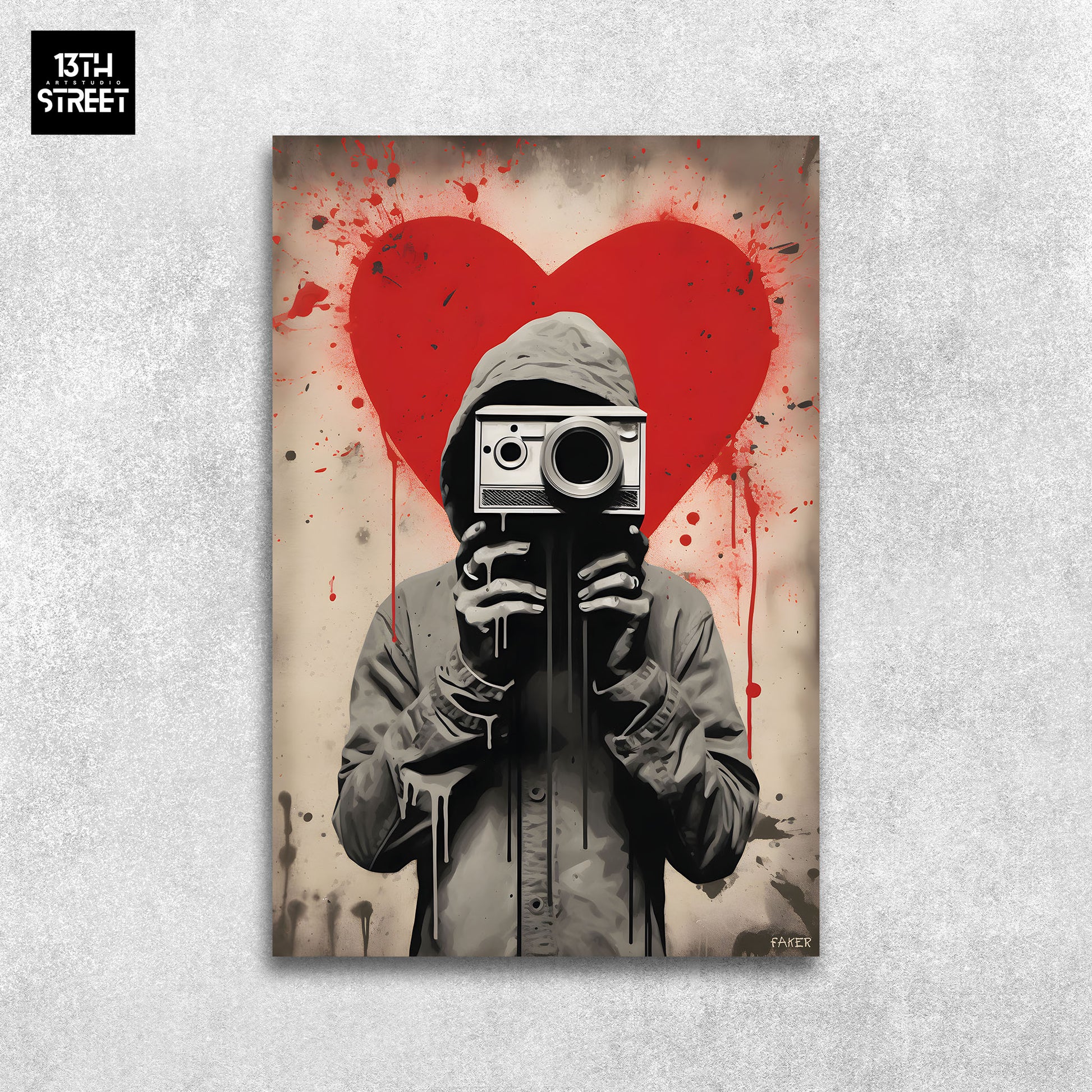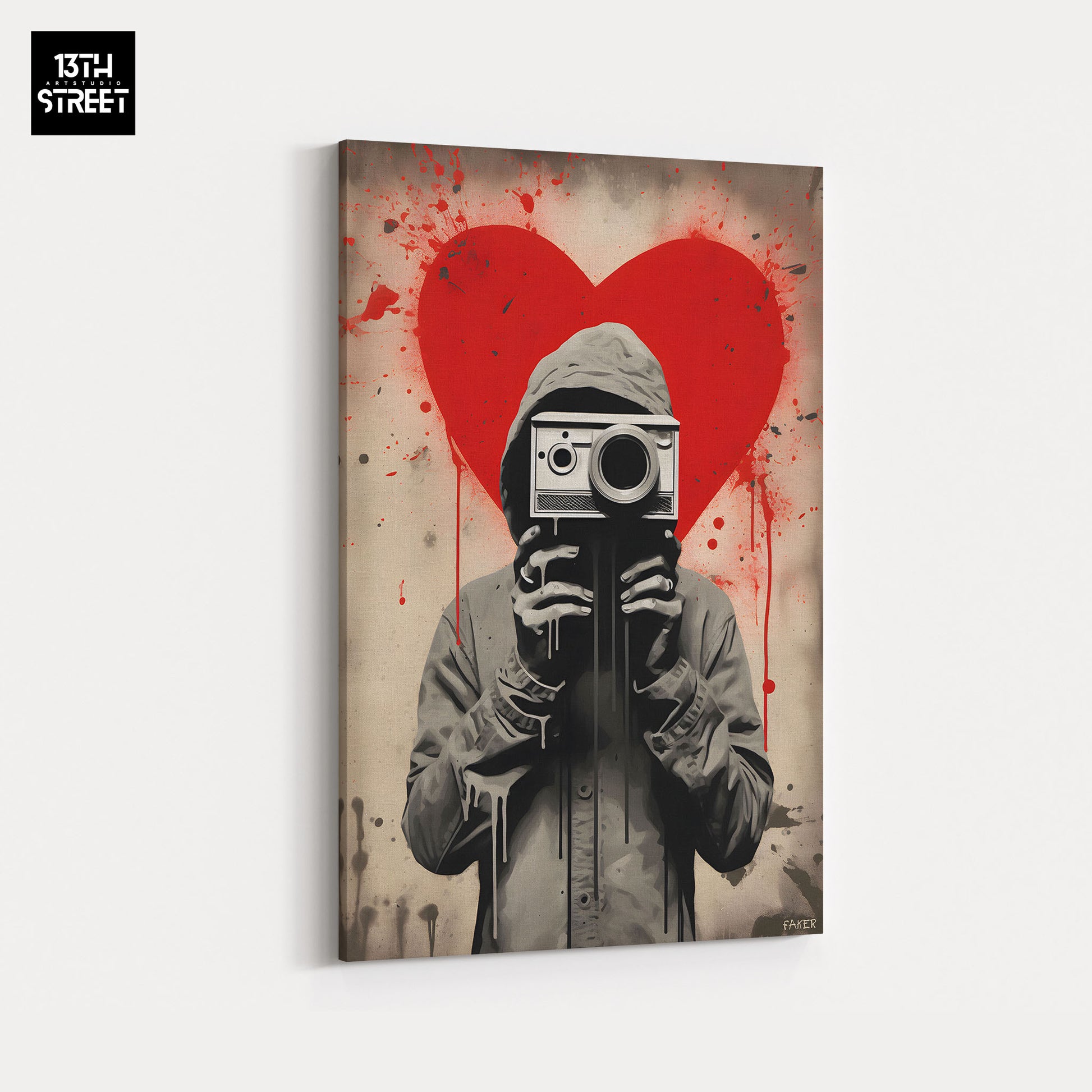 Discover “ First Encounter ” by artist Faker . This captivating canvas depicts a man whose face is hidden behind a camera, symbolizing modern encounters through the lens of photography. First Encounter is an Artwork that raises questions about the nature of human interaction in the digital age. Explore Faker’s creative talent, supported by the artistic community of 13th Street Art , and delve into a reflection on connection and distance in our contemporary society.