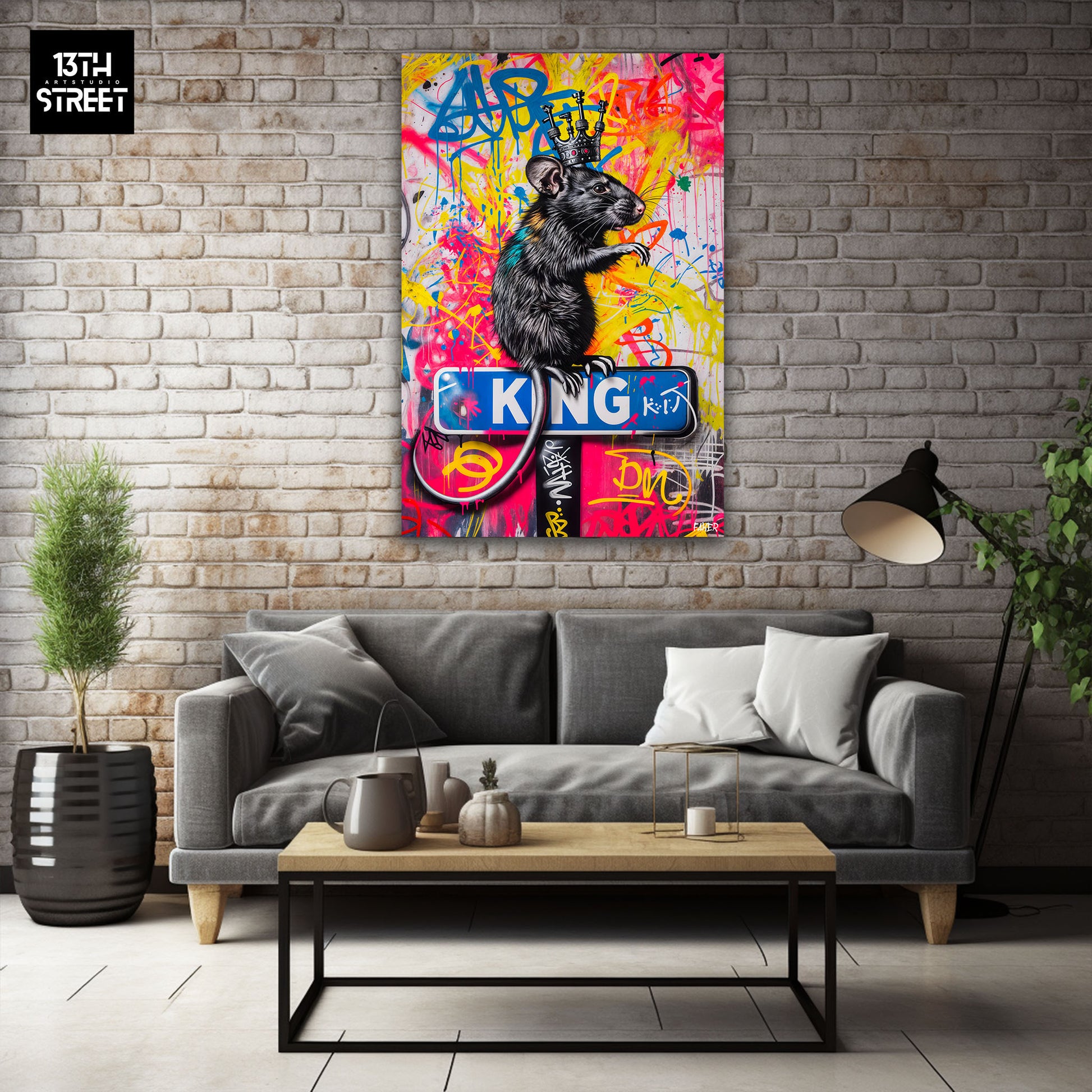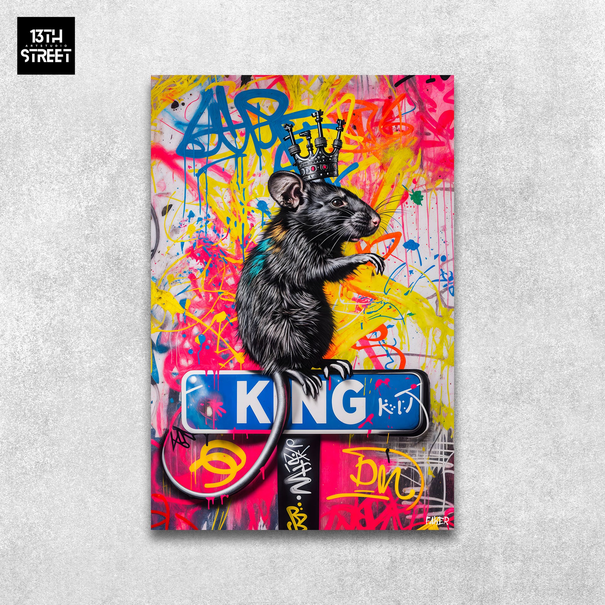 Discover “ Rat King ” by artist Faker . This canvas features a bold, modern interpretation of the Rat King character, infused with vibrant street art energy. The Rat King is depicted with a contemporary twist, blending graffiti elements and vibrant colors to create a dynamic and impactful image. The striking details and urban motifs accentuate the character’s regal stature while giving him a decidedly modern feel. “Rat King” is an Artwork that combines majesty and modernity, bringing a touch of rebellious sophistication to your collection. Supported by the 13th Street Art community, this unique canvas is a bold addition that infuses your space with a distinctive personality.
