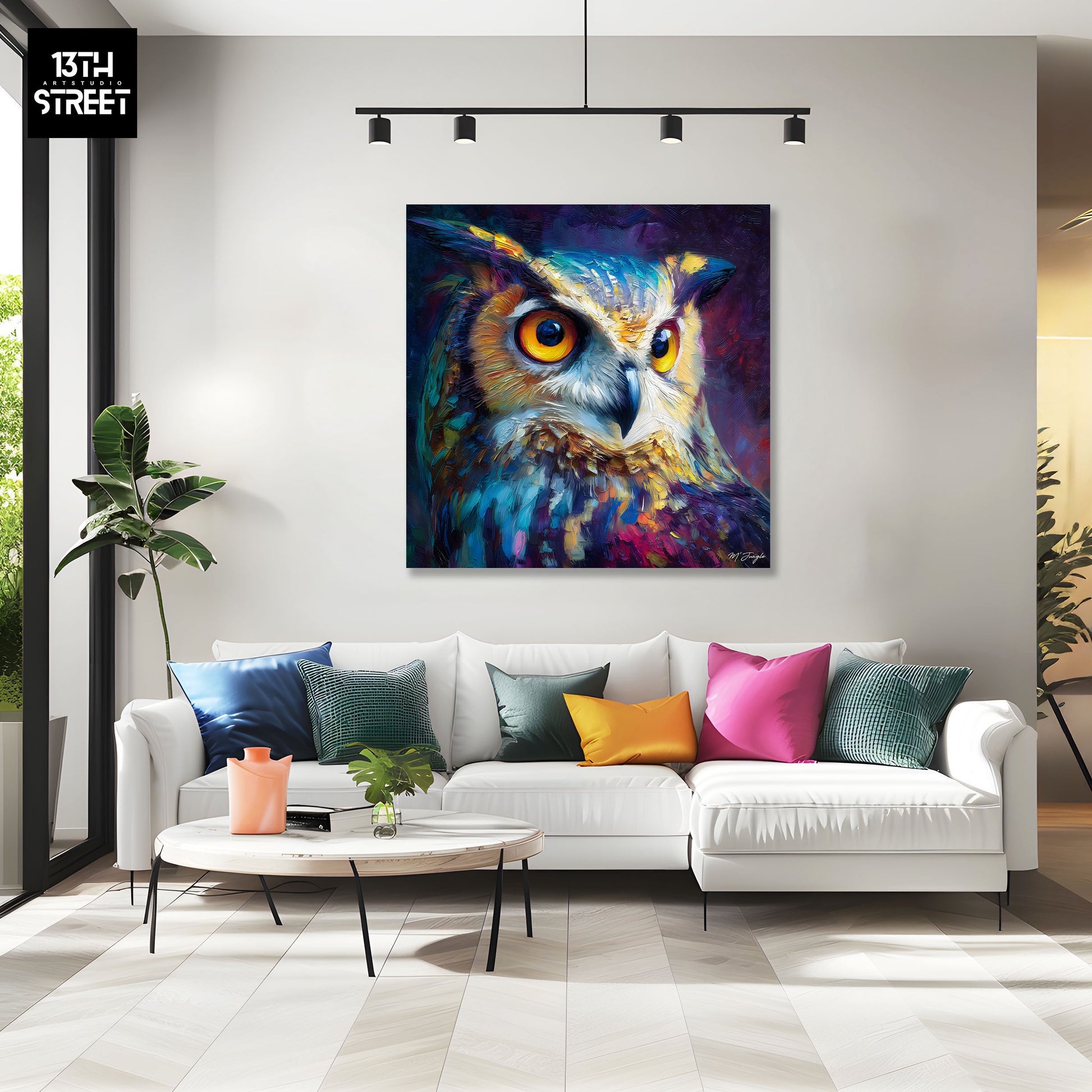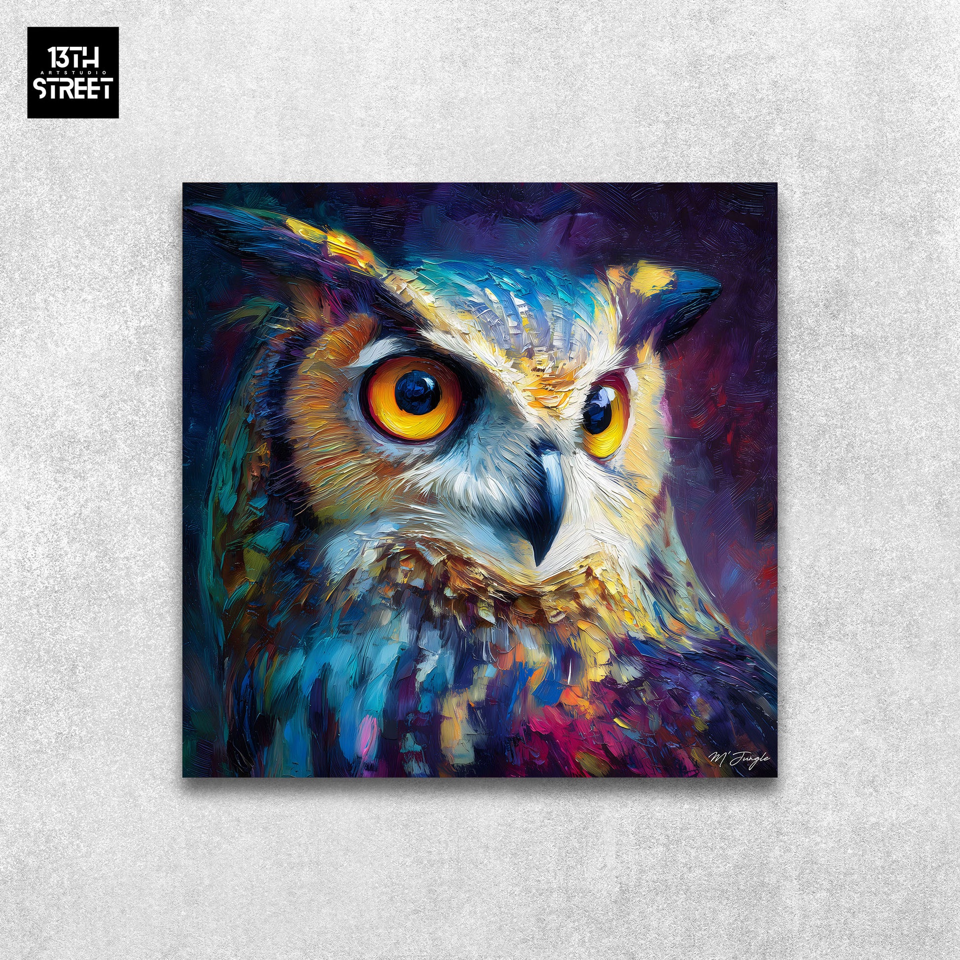 Œuvre artistique "Mémoire de l’ombre" symbolise le mystère et la sagesse à travers un langage visuel animalier contemporain. Le hibou devient le sujet principal de l’œuvre, incarnant l’intelligence nocturne et l’expression graphique propre à l’univers de Miss Jungle.