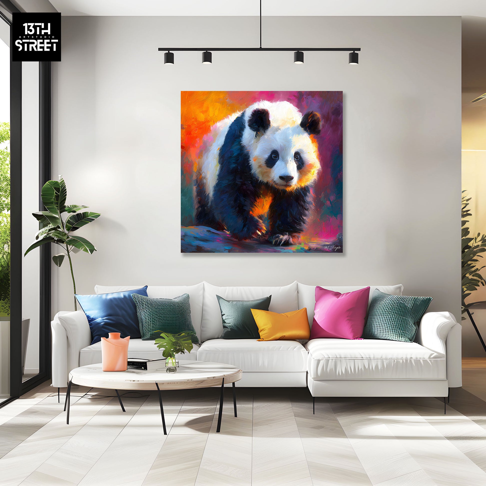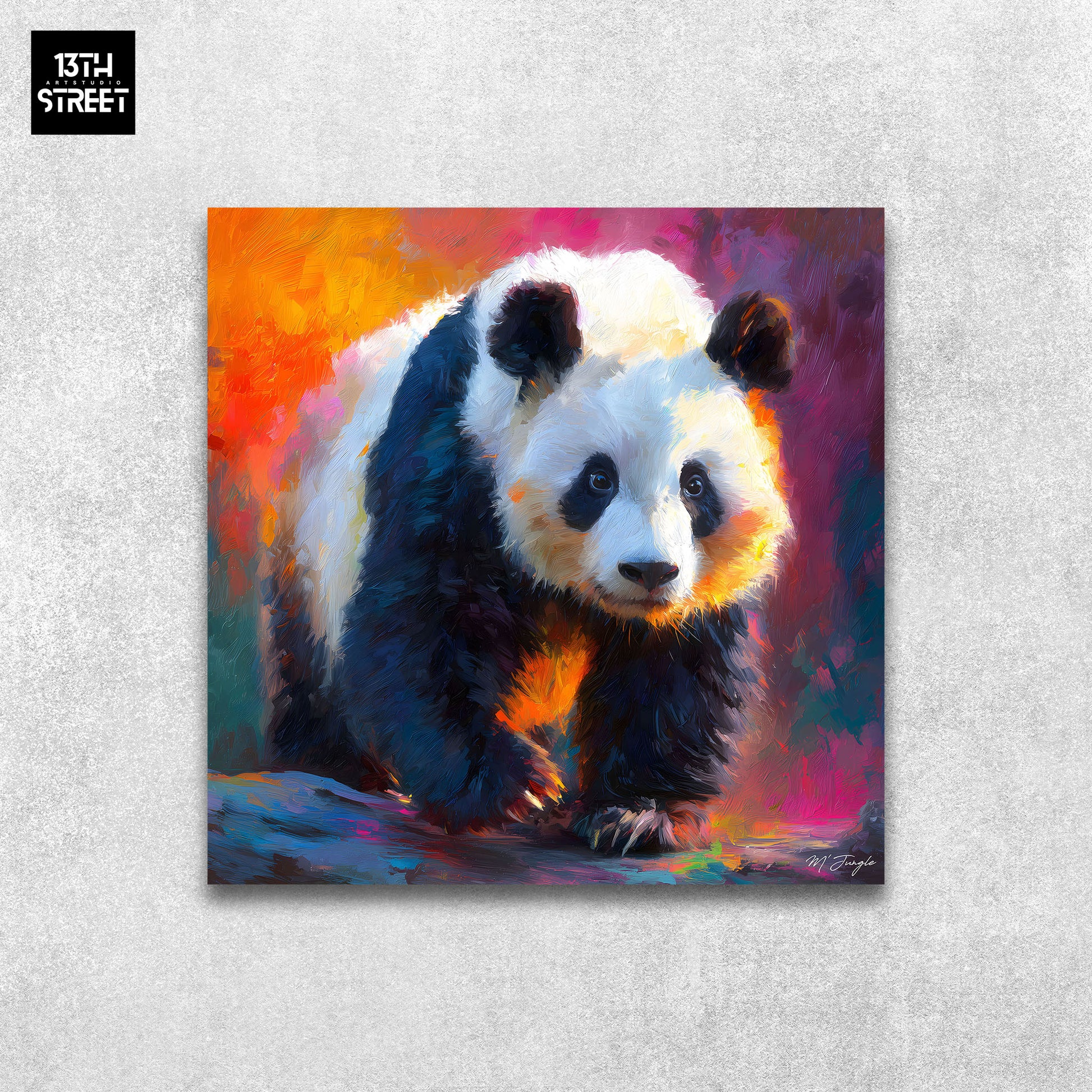 Découvrez "Paix en couleurs" par l’artiste Miss Jungle. Dans un univers artistique animalier, l’œuvre représente panda géant dans une posture calme et équilibrée, mettant en valeur la douceur de son expression et l’harmonie naturelle associée à cet animal. La composition traduit la sérénité et la symbolique apaisante du sujet.