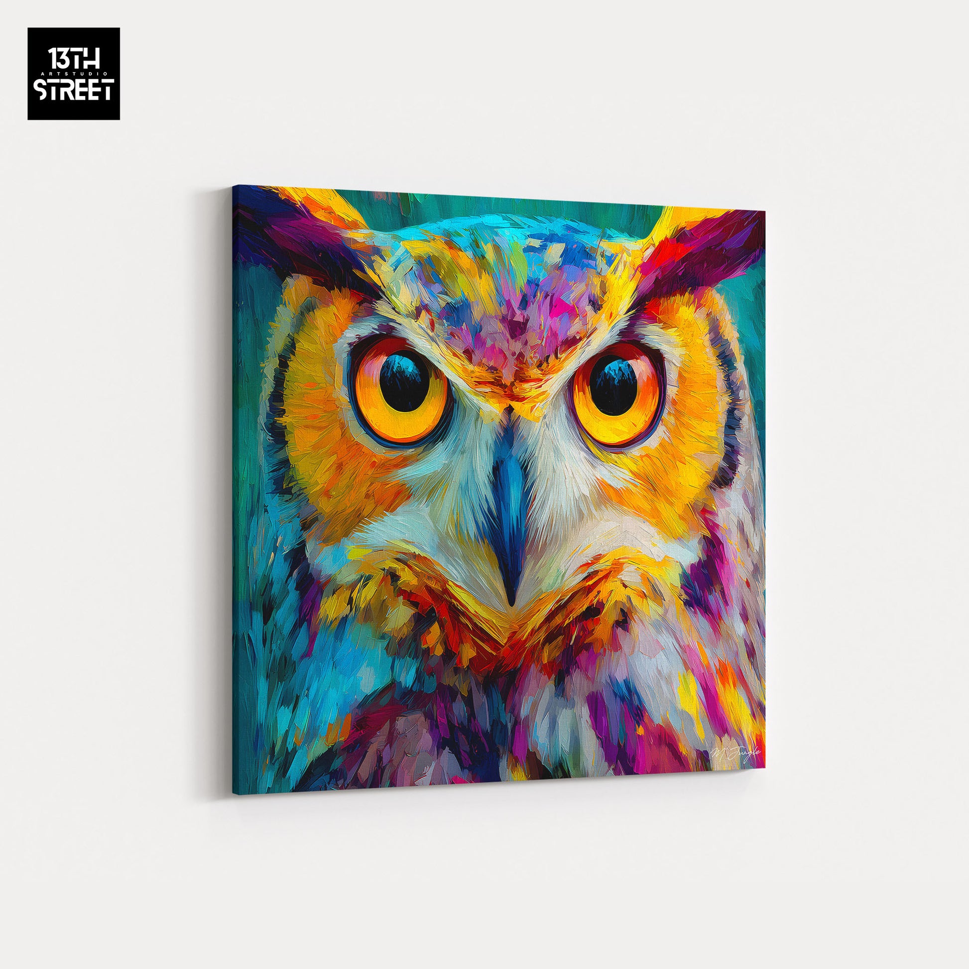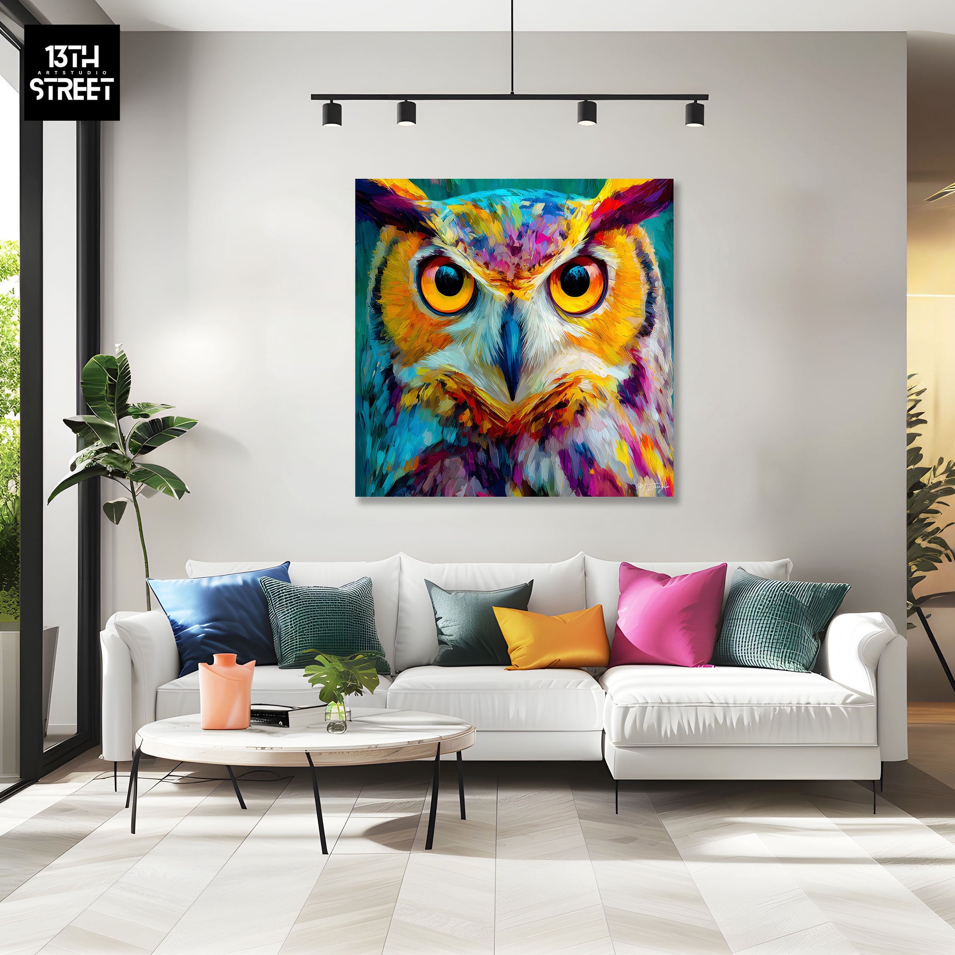 Œuvre artistique "Sagesse chromatique" symbolise l’intelligence et le mystère du hibou à travers un langage visuel animalier contemporain. Le portrait transforme l’animal en sujet principal de l’œuvre, révélant la puissance symbolique et graphique propre au style de Miss Jungle.