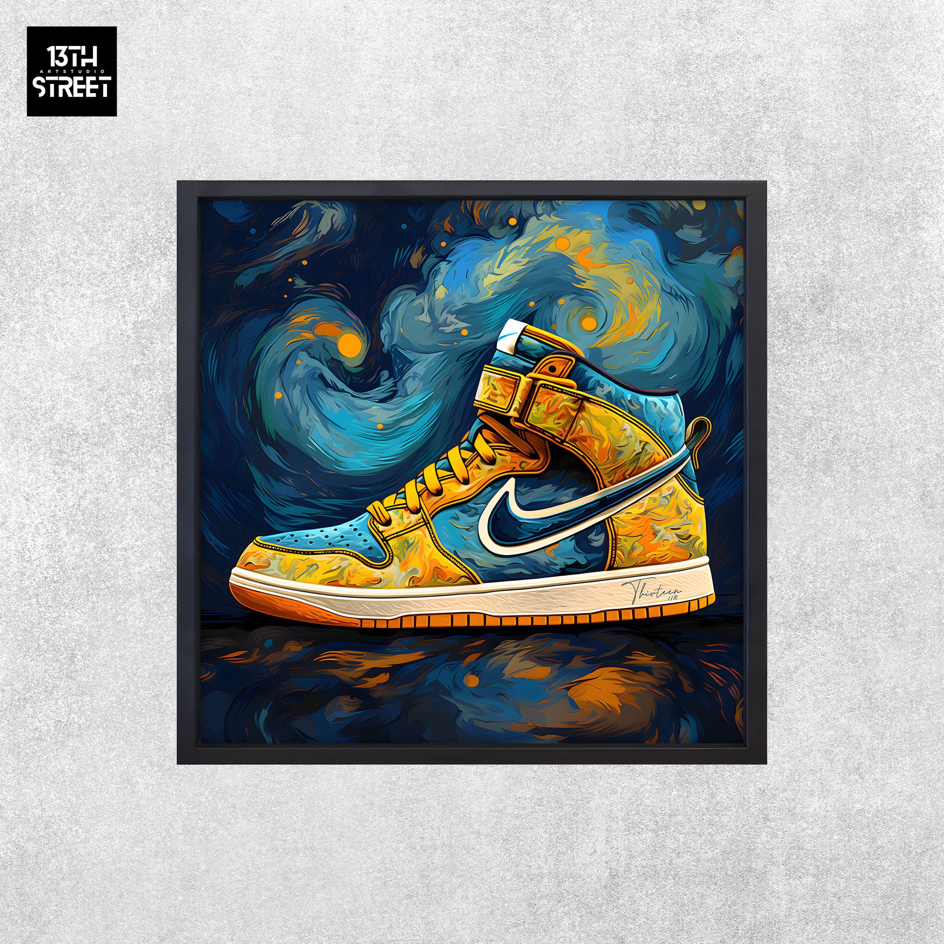 Discover " Nike Jordan by Vincent Van Gogh " by artist Thirteen . This captivating work fuses Van Gogh's swirling brushstrokes and vibrant colors with the iconic Nike Jordan silhouette, creating a piece that marries classic artistic expression with modern street culture. "Nike Jordan by Vincent Van Gogh" is a limited edition that infuses your collection with timeless beauty and vibrancy. Immerse yourself in the vibrant world of Thirteen, supported by the 13th Street Art community. Transform your space with this work that celebrates the intersection of Impressionist art and iconic Jordan style.