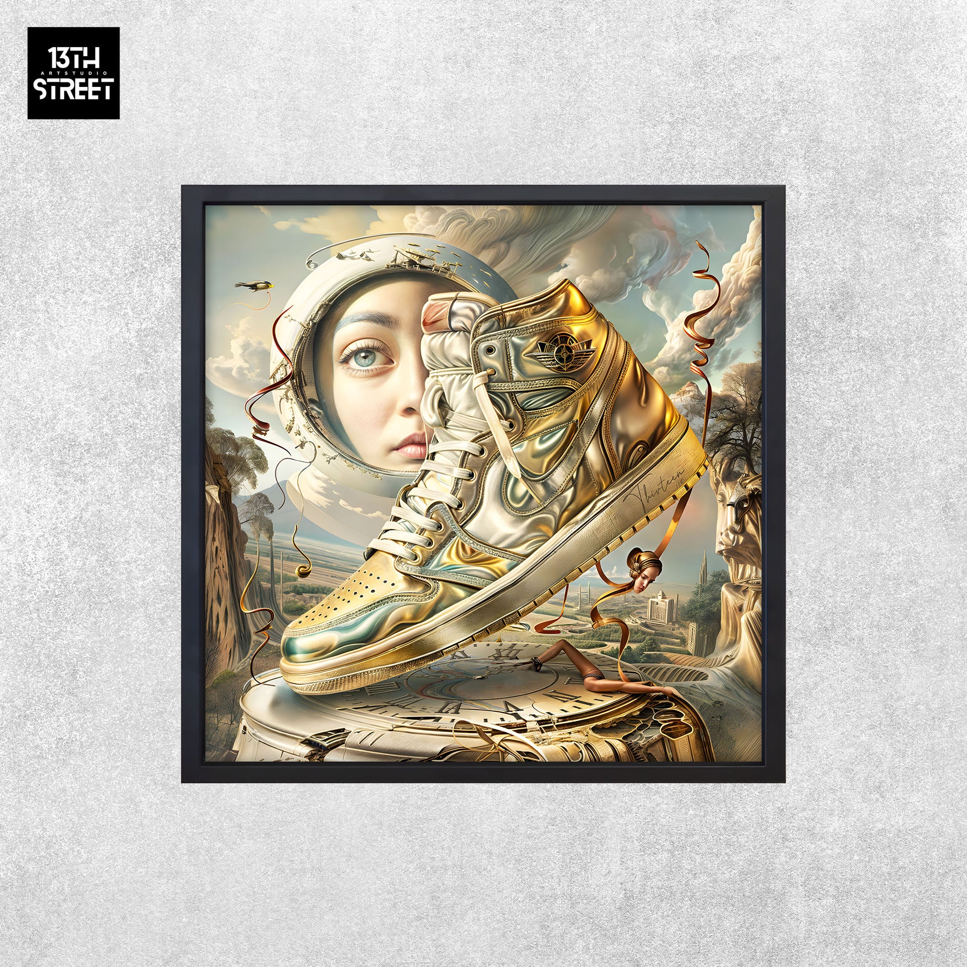 Discover “ Nike Jordan by Salvador Dalí ” by artist Thirteen . This mesmerizing work fuses Salvador Dalí’s dreamlike surrealism with the iconic Nike Jordan silhouette, creating a piece that defies convention and invites captivating visual exploration. “Nike Jordan by Salvador Dalí” is a limited edition that infuses your collection with a touch of mystery and creativity, capturing the essence of Dalí’s dreams and wild imagination while celebrating the iconic Jordan style. Immerse yourself in the intriguing world of Thirteen, supported by the 13th Street Art community. Transform your space with this work that celebrates the intersection of surrealist art and legendary Jordan design.