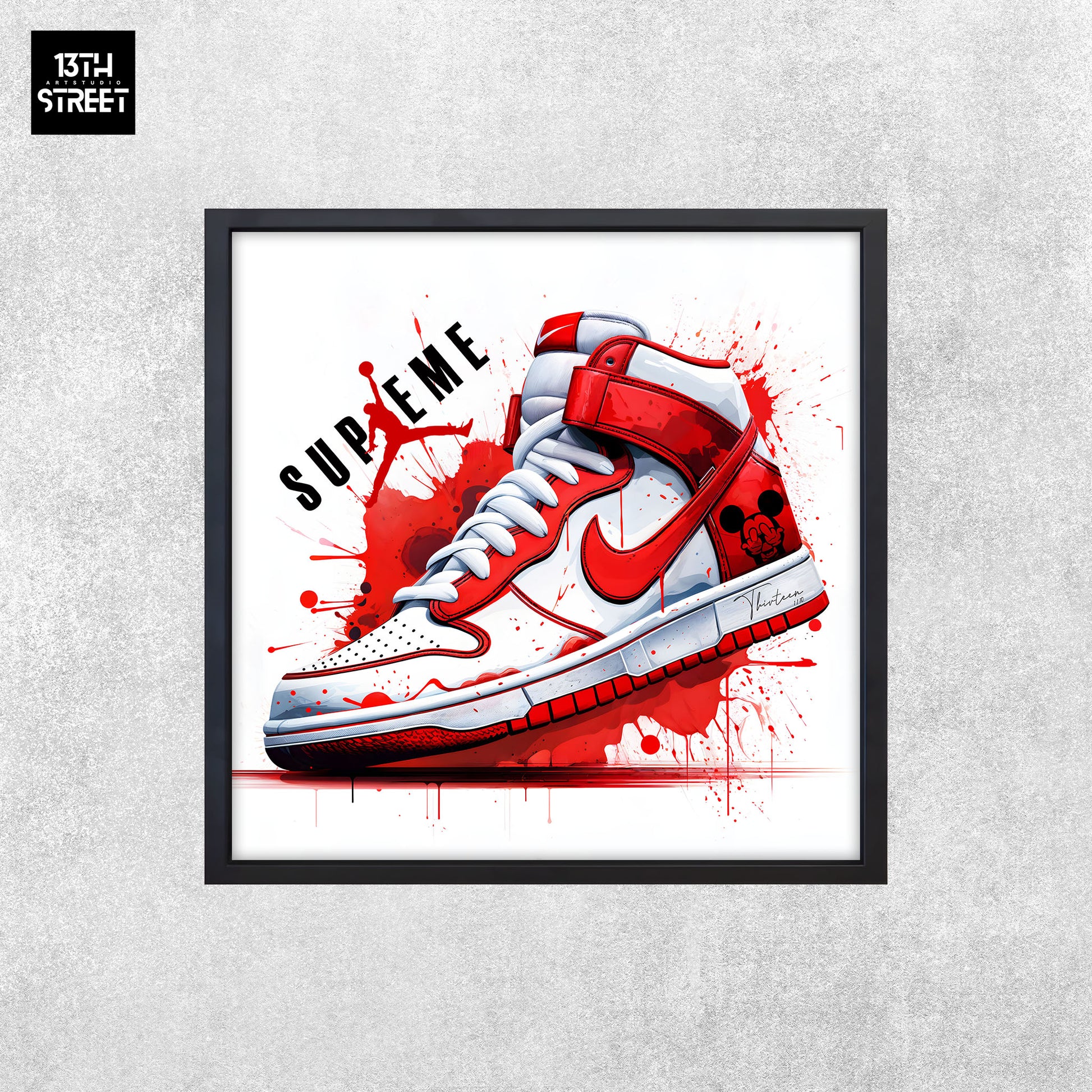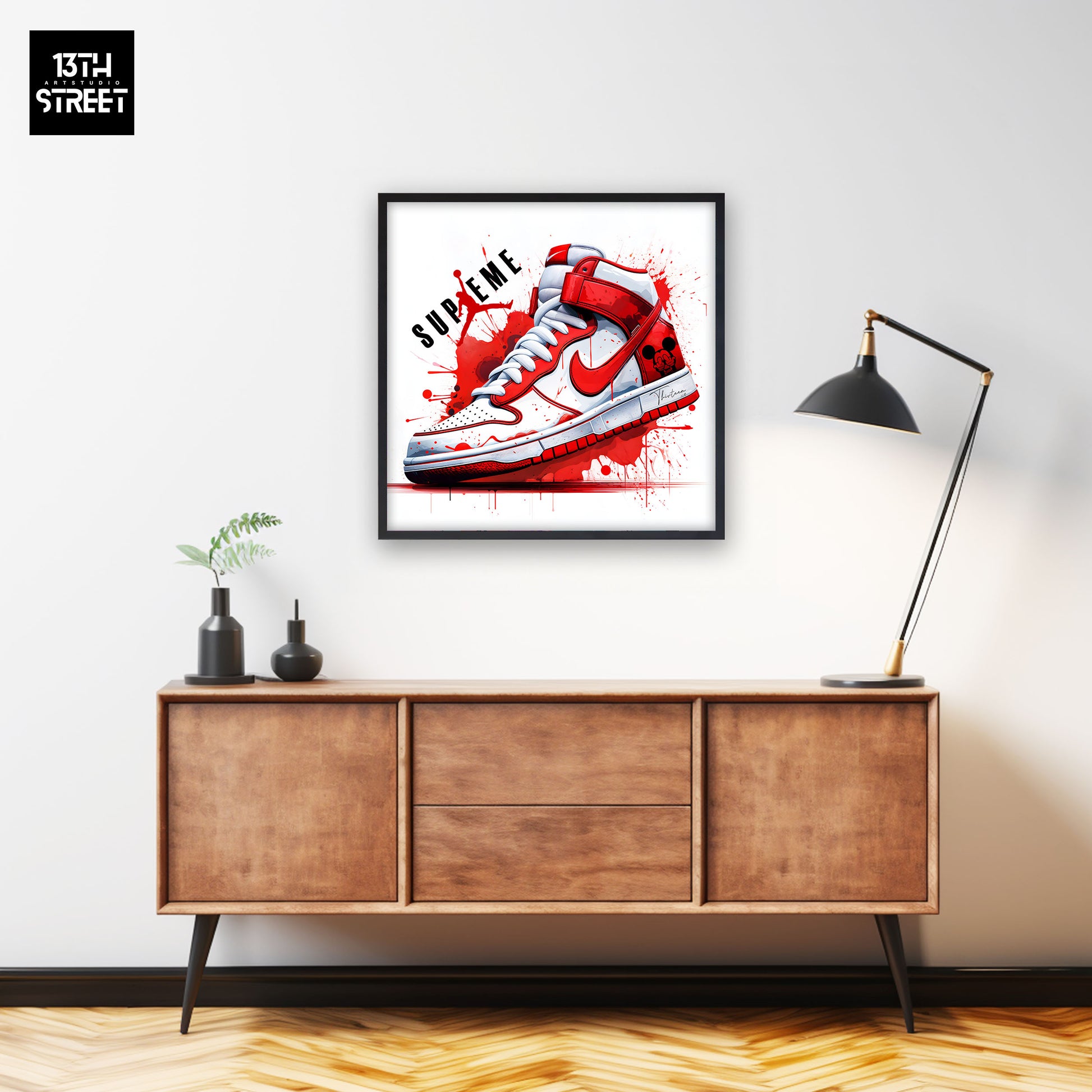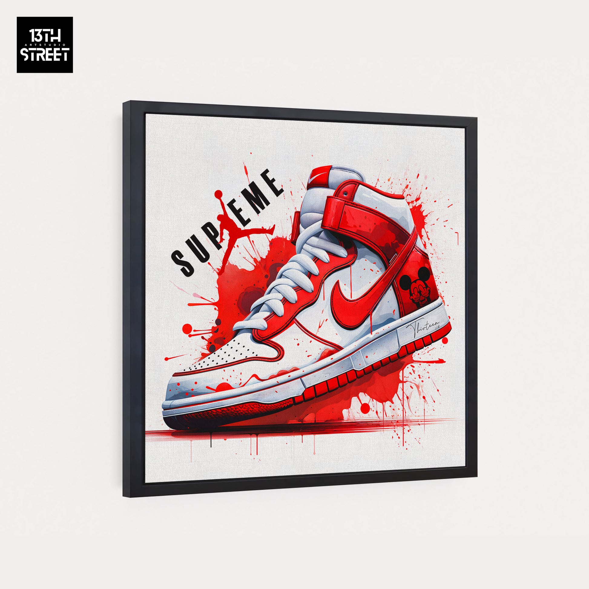 Discover “ Nike Jordan by Supreme ” by artist Thirteen . This impactful work fuses Supreme’s bold, forward-thinking aesthetic with the iconic Nike Jordan silhouette, creating a piece that embodies the spirit of contemporary streetwear. “Nike Jordan by Supreme” is a limited edition that brings a dynamic, on-trend feel to your collection, capturing the essence of Supreme’s innovation and visual impact while celebrating the legendary Jordan design. Immerse yourself in the vibrant world of Thirteen, supported by the 13th Street Art community. Transform your space with this work that celebrates the intersection of cutting-edge street art and iconic Jordan style.
