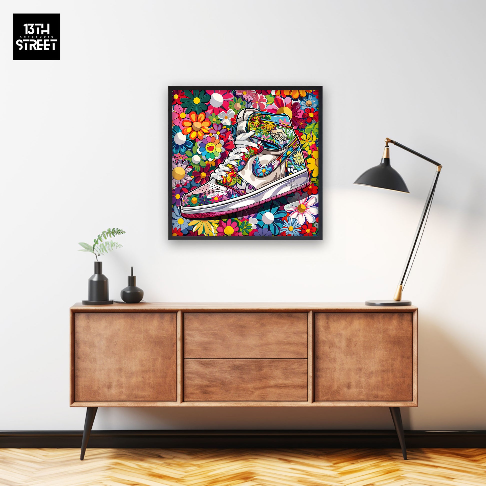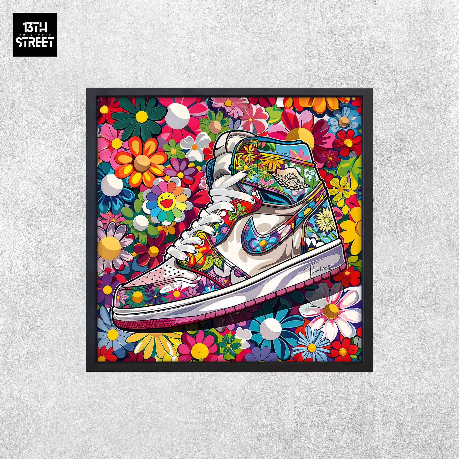 Discover " Nike Jordan by Takashi Murakami " by artist Thirteen . This vibrant work fuses Takashi Murakami's signature vibrant patterns and pop colors with the iconic Nike Jordan silhouette, creating a piece that blends contemporary art and street culture. "Nike Jordan by Takashi Murakami" is a limited edition that infuses your collection with a touch of vibrancy and sophistication, capturing the essence of modern Japanese art and the iconic Jordan style. Immerse yourself in the vibrant world of Thirteen, supported by the 13th Street Art community. Transform your space with this work that celebrates the fusion of Murakami's bold artistry and legendary Jordan design.