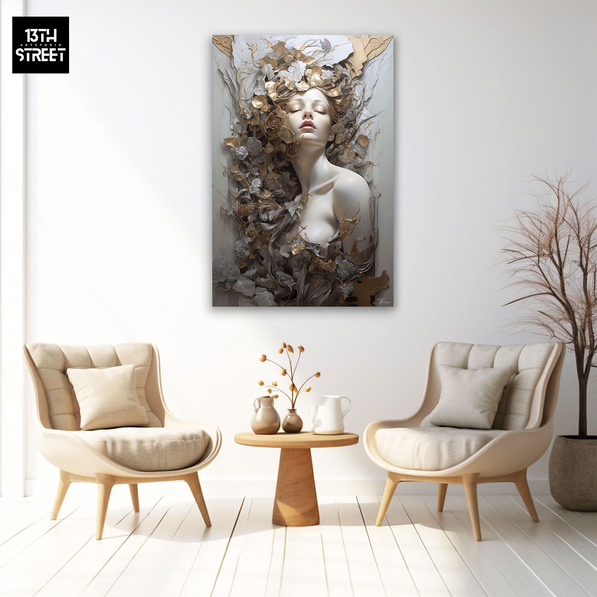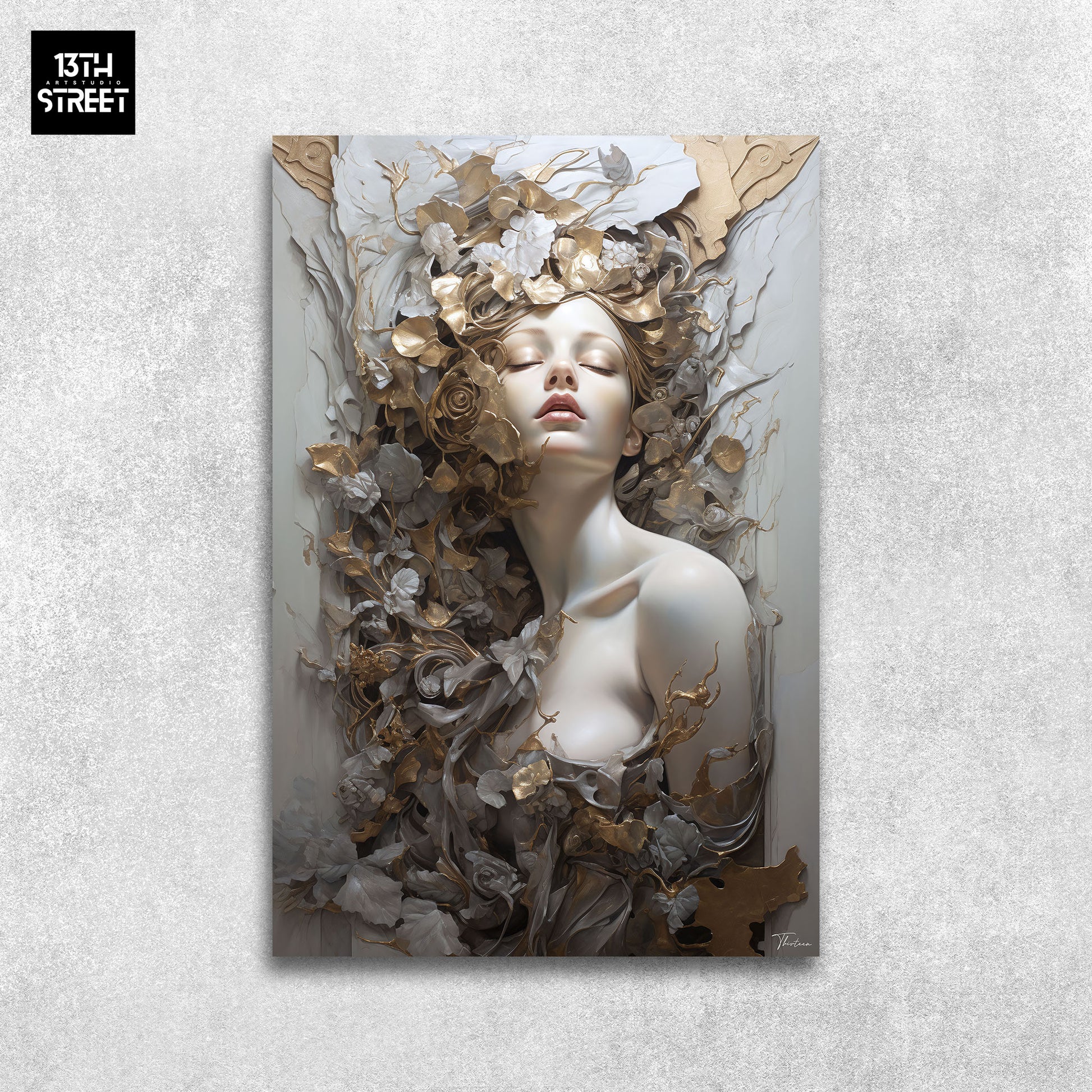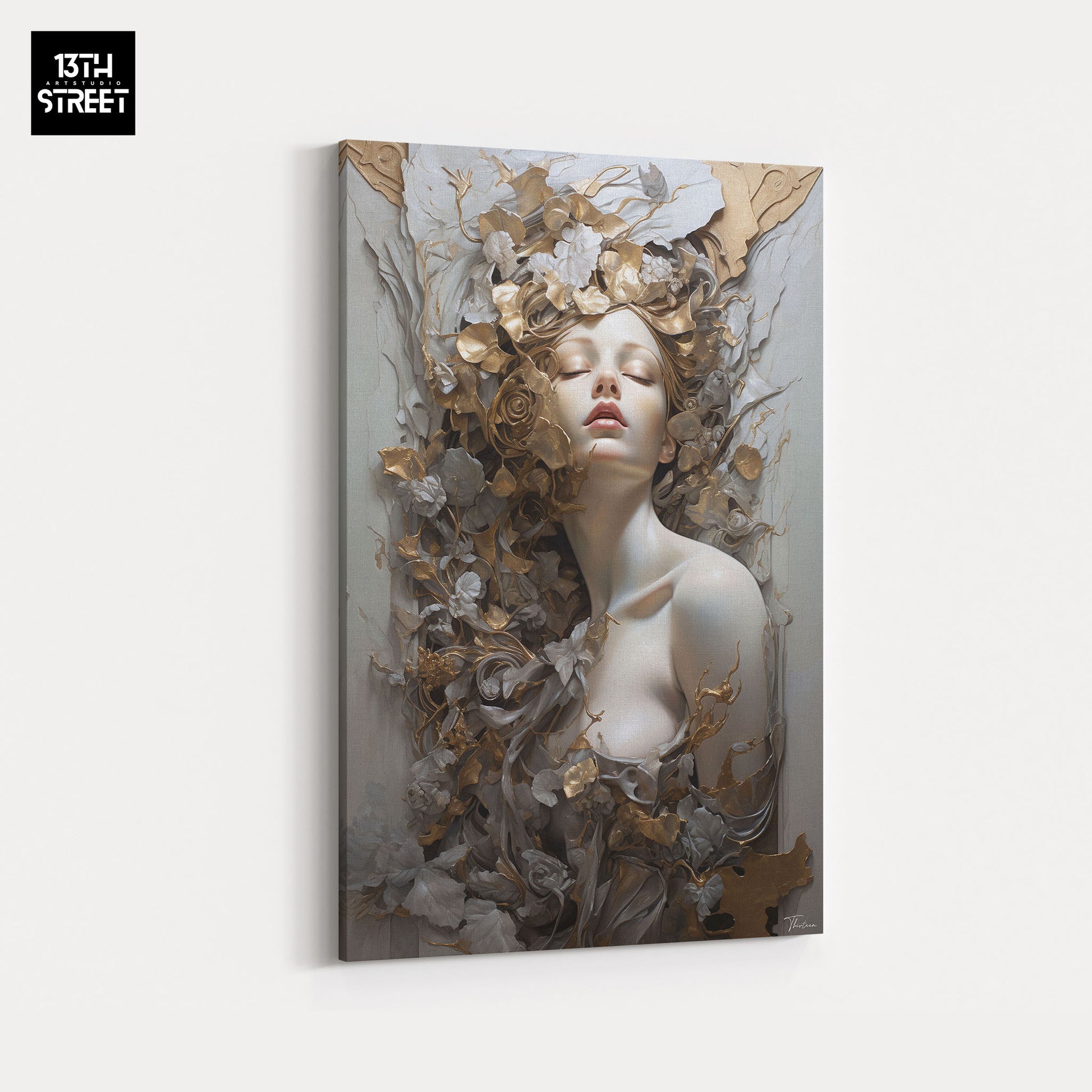 Discover " Exhilarating Gold " by artist Thirteen . This captivating canvas features a portrait of a woman magnified by golden tones, evoking an aura of exaltation and magnificence. "Exhilarating Gold" is a Work of Art , bringing a special exclusivity to your collection. Immerse yourself in the creative world of Thirteen, supported by the artistic community 13th Street Art . Transform your space with a dose of emotion and grandeur thanks to this canvas that celebrates feminine beauty and splendor.