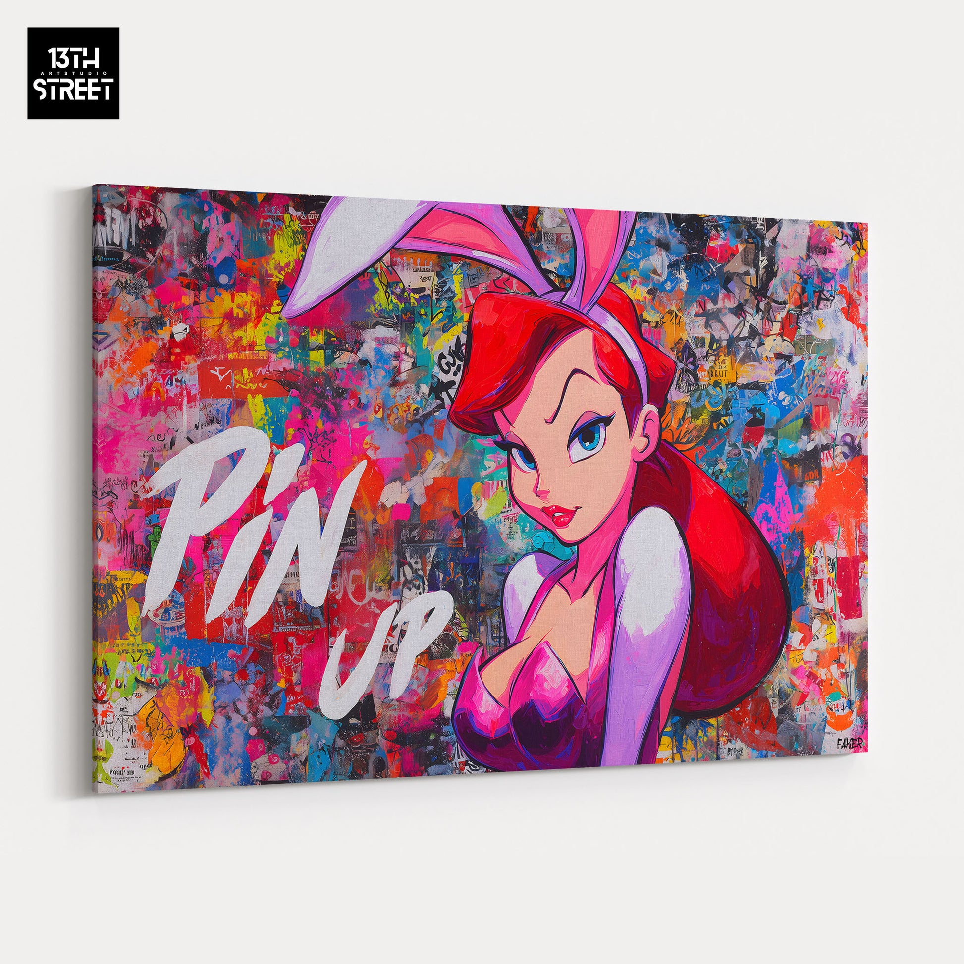 Découvrez "Jessica Rabbit Hot Power" par l’artiste Faker. Dans cette œuvre street art sensuelle et affirmée, le personnage Jessica Rabbit est représenté dans une posture charismatique et audacieuse, incarnant la puissance féminine et l’attitude glamour du street art contemporain.
