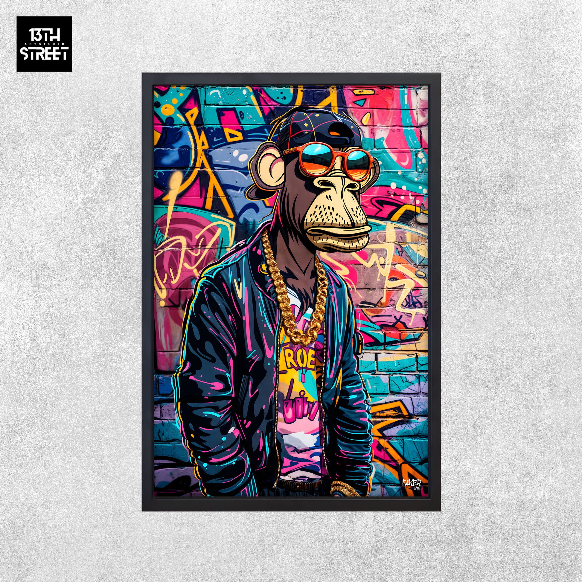 Découvrez "Monkey Bored Gangsta Rap" par l'artiste Faker. Cette édition limitée présente un singe en pleine ambiance de rap, vêtu d'une tenue de gangsta avec des accessoires emblématiques, tout en affichant une expression d'ennui hilarante. Le contraste entre l'attitude normalement intense du rap et le visage désinvolte du singe crée une ironie rafraîchissante, injectant une touche d'humour dans le monde du hip-hop. Les détails dynamiques et les influences de street art insufflent une énergie contemporaine à cette œuvre. "Monkey Bored Gangsta Rap" est une toile en édition limitée qui combine l'esprit du rap avec une dose d'humour décalé, apportant une note originale et vivante à votre espace. Soutenue par la communauté artistique 13th Street Art, cette pièce unique est parfaite pour ceux qui cherchent à ajouter une touche de créativité et de personnalité à leur collection.